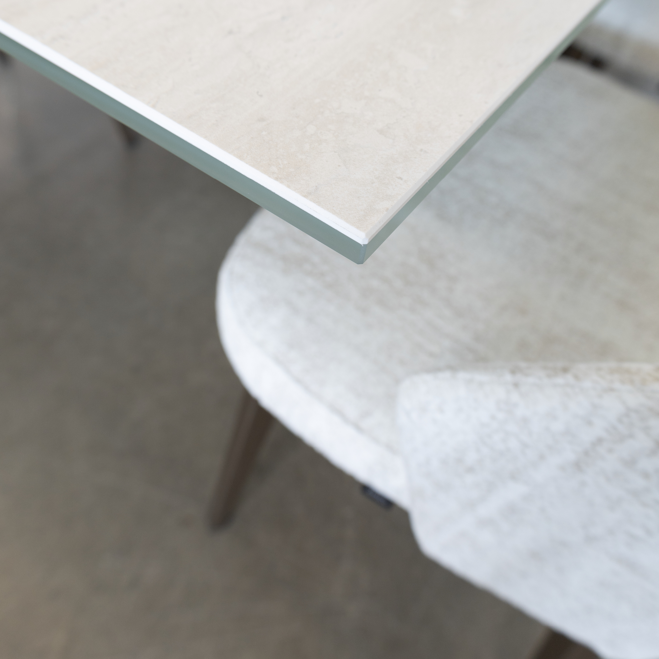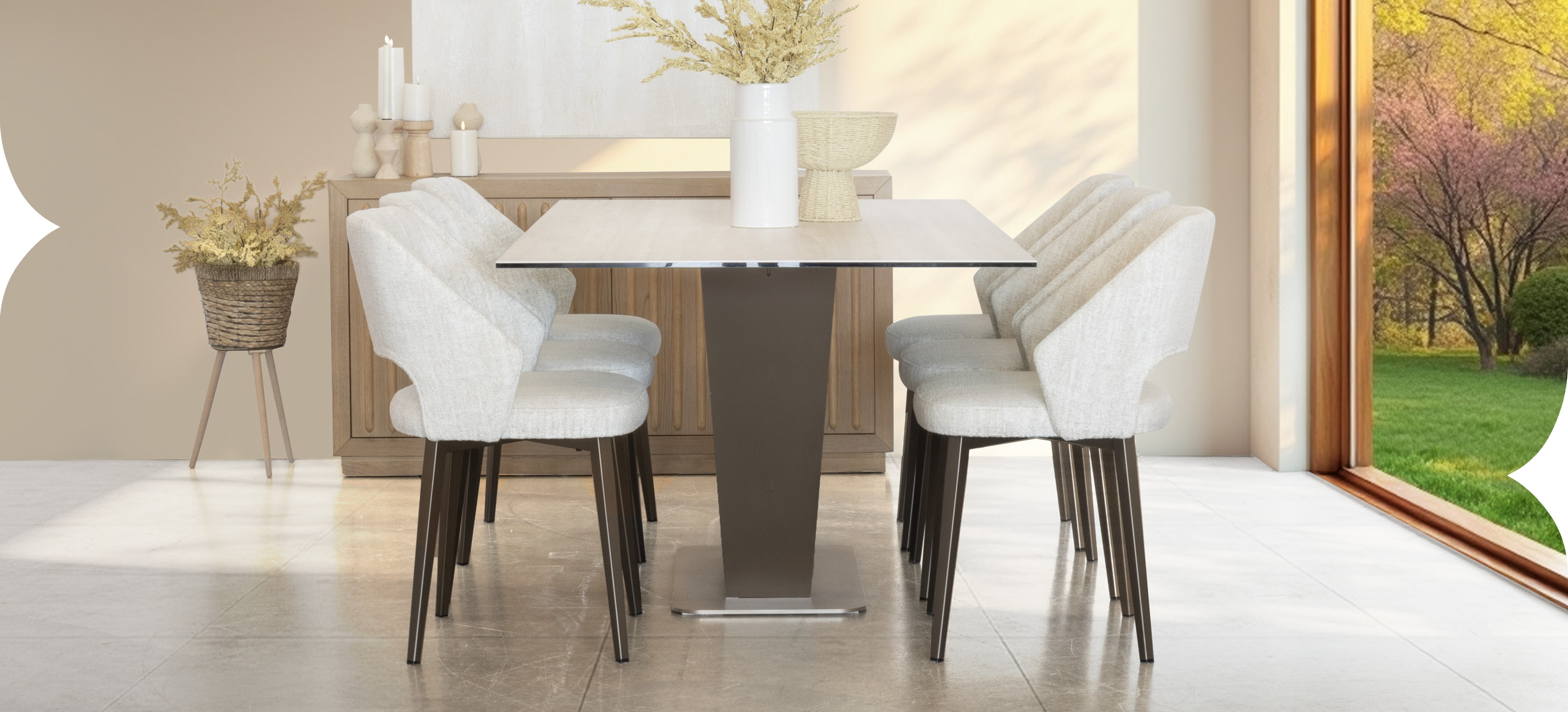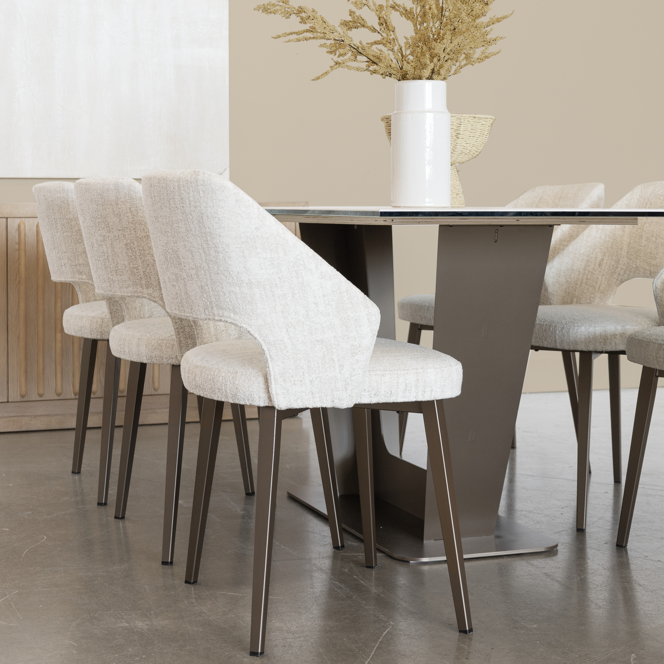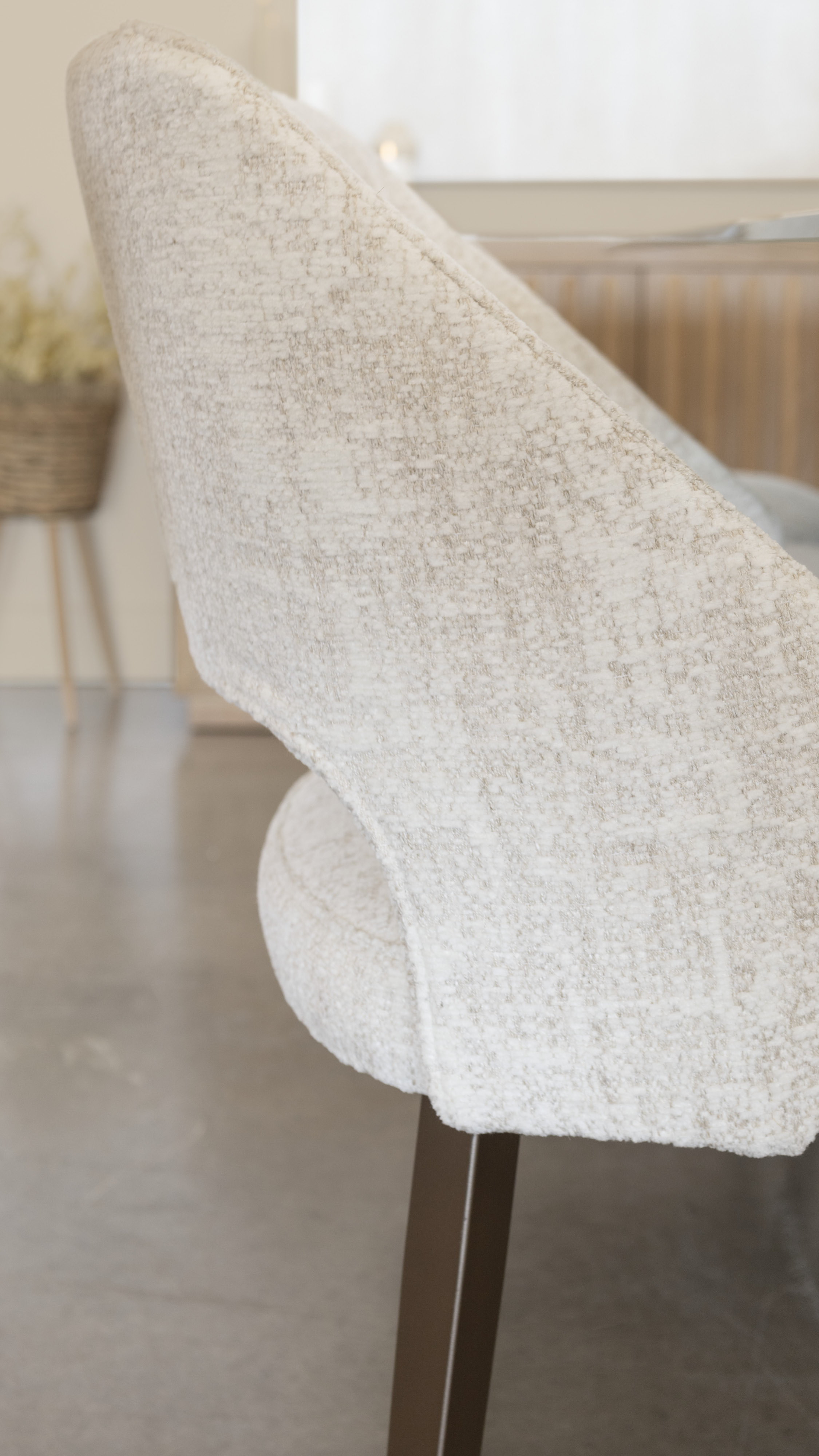 Les chaises Amisco au revêtement en tissu bouclé couleur crème s’intègrent harmonieusement dans cet univers feutré. Leur texture douce et enveloppante rappelle la richesse sensorielle du travertin de la table, tout en ajoutant une chaleur visuelle qui contrebalance les surfaces plus lisses. Leur accent doré subtil, intégré au tissage, capte délicatement la lumière et apporte une note de sophistication discrète. Les pieds en métal champagne, assortis à la base de la table, assurent une continuité visuelle. Leur forme arrondie, avec un dossier légèrement ouvert, allège l’ensemble et invite à de longs repas dans un confort absolu.