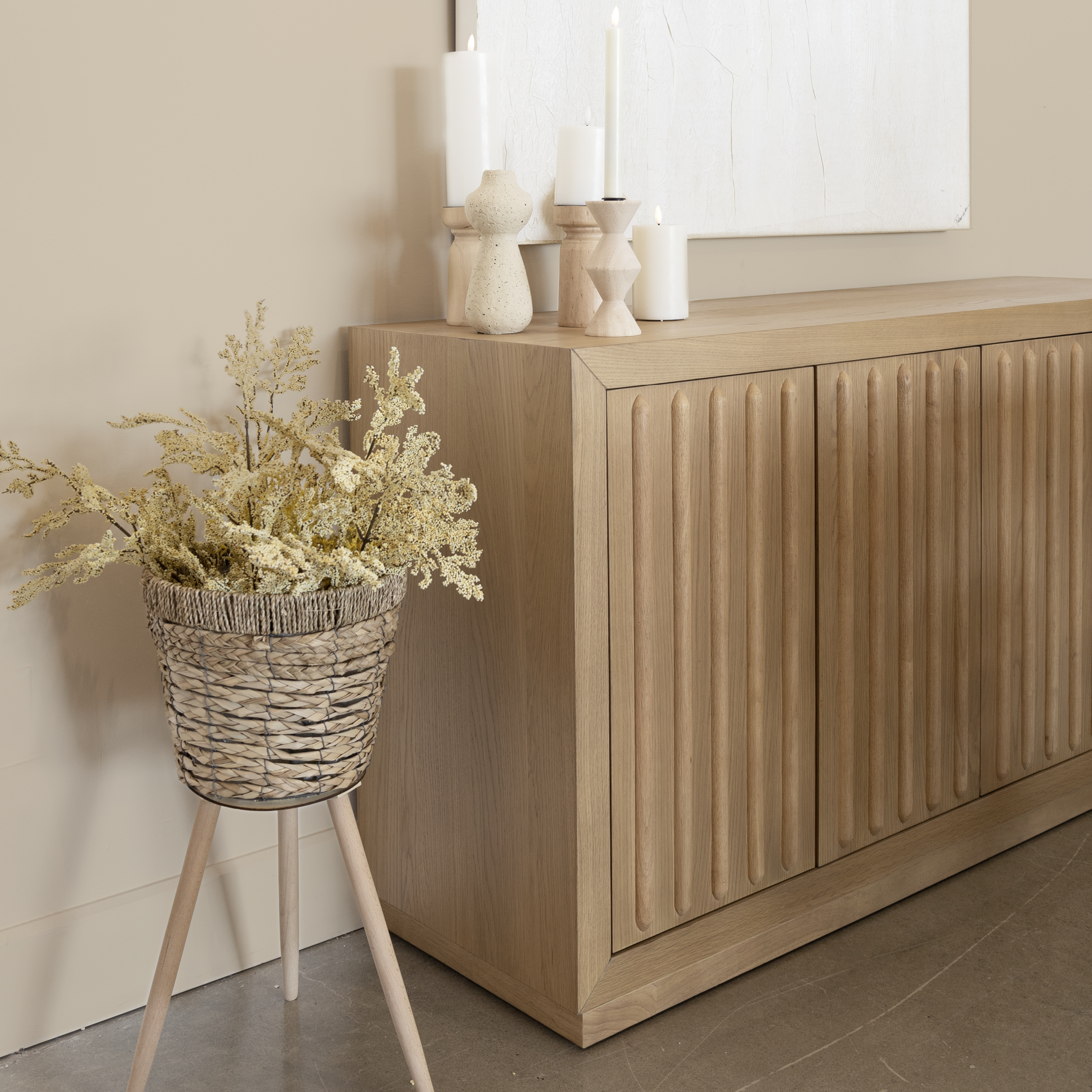 Complétant l’ensemble, le buffet en bois blond apporte à la salle à manger une touche naturelle. Ses portes texturées, aux lignes finement sculptées, offrent un jeu d’ombres subtil qui ajoute de la profondeur au décor. Son design épuré lui permet de s’intégrer à différentes essences de bois, rendant cette pièce aussi esthétique que polyvalente. Pratique, il offre un espace de rangement généreux pour la vaisselle, le linge de table et les accessoires du quotidien, tout en conservant un aspect visuel léger et fluide. Il se prête aussi à l’ajout d’éléments décoratifs, comme un tableau ton sur ton avec effet 3D de style collage en papier, des vases en céramique texturée ou encore quelques bougies asymétriques pour insuffler une touche vivante à la pièce.