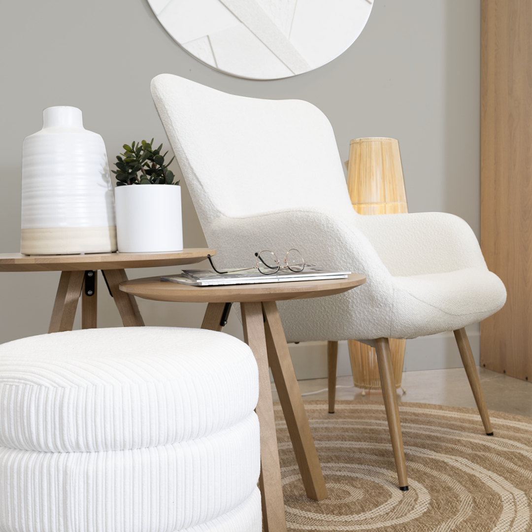 La clé de cette tendance repose sur la richesse des textures qui se superposent avec finesse. Du fauteuil Huggy en fausse fourrure moelleuse agencé au banc coffre placé au bout de lit, en passant par le jeté en laine beige au tissage rustique, chaque détail est pensé pour créer une ambiance apaisante et chaleureuse.