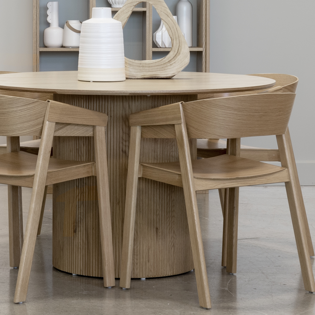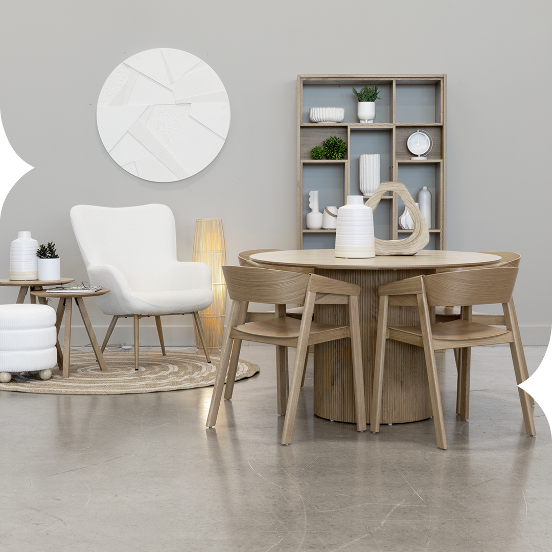 Au cœur de cette composition, la table ronde Tovas en bois blond attire tous les regards. Son design impressionnant, soutenu par un large pied central au fini sculptural, en fait une pièce qui se démarque. La forme circulaire favorise les moments d'échange et de partage, tout en s'intégrant parfaitement dans les petits comme les grands espaces.