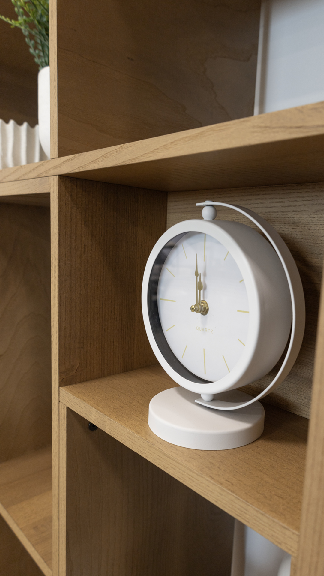 En toile de fond, une bibliothèque Jude également en bois blond vient parfaire l’harmonie de la pièce. Ses compartiments ouverts et irréguliers permettent d'exposer des objets décoratifs, comme des vases en céramique blanche, des plantes vertes ou encore une horloge minimaliste.