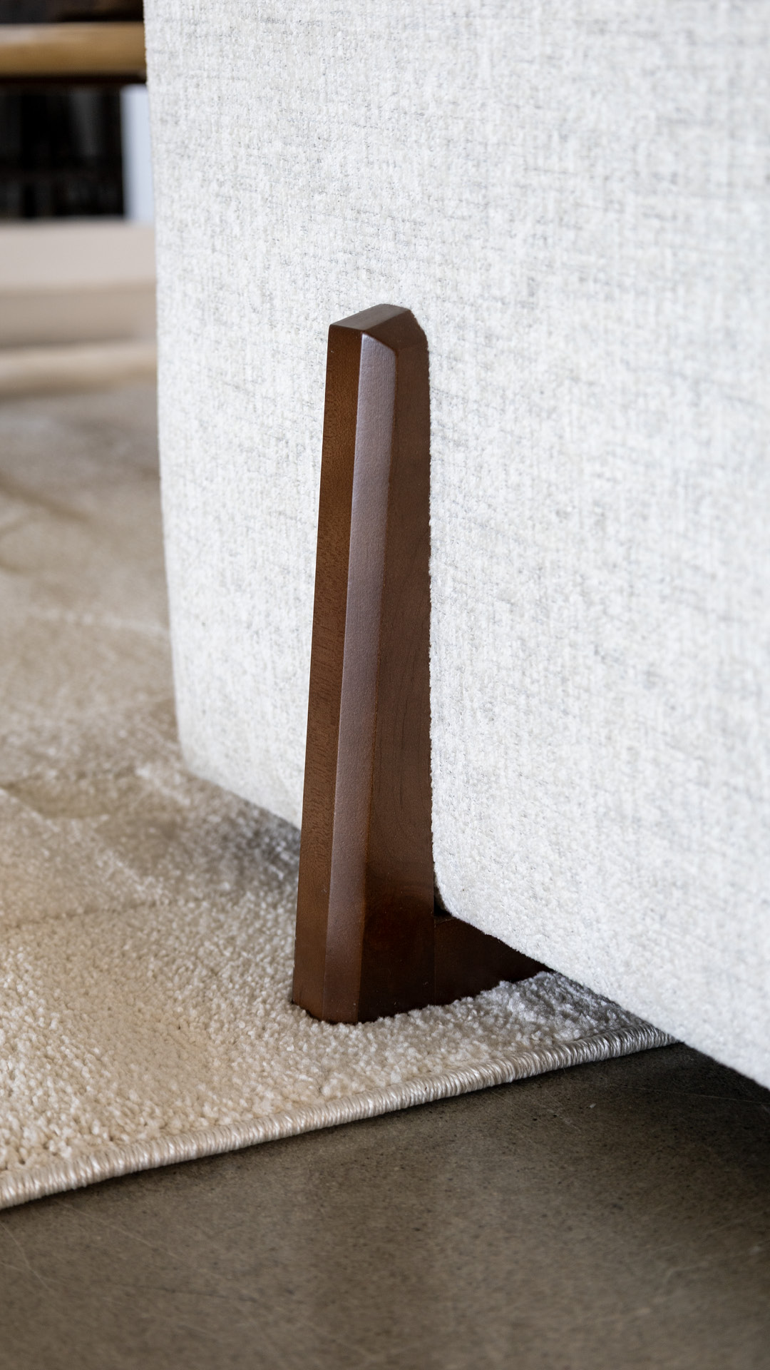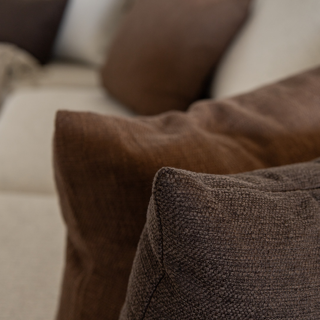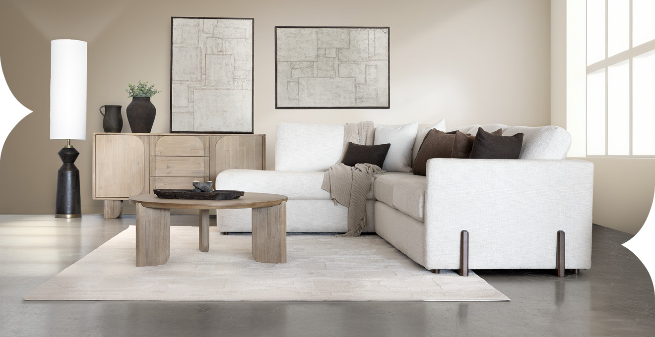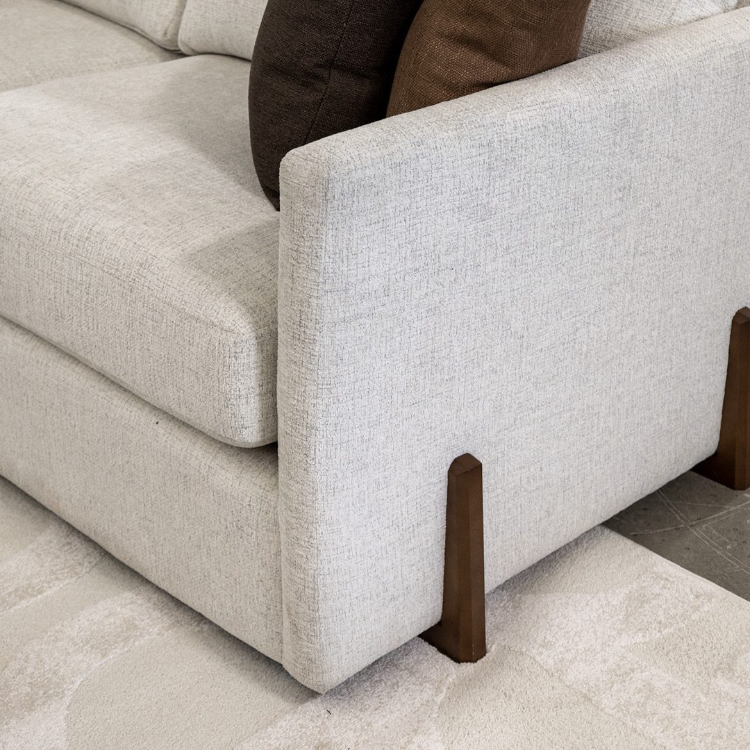 Pièce maîtresse de cette pièce, le sectionnel Malibu signé Décor-Rest allie ergonomie et lignes épurées. Son tissu ivoire illumine la pièce tout en restant classique, tandis que ses accoudoirs fins et ses coussins fixes structurent l'espace avec légèreté. L'assise, à la fois profonde et soutenante, invite à la détente. Quant aux pattes de bois brun chocolat, proposées en option, elles ajoutent une note chaleureuse sans voler la vedette au reste du mobilier.