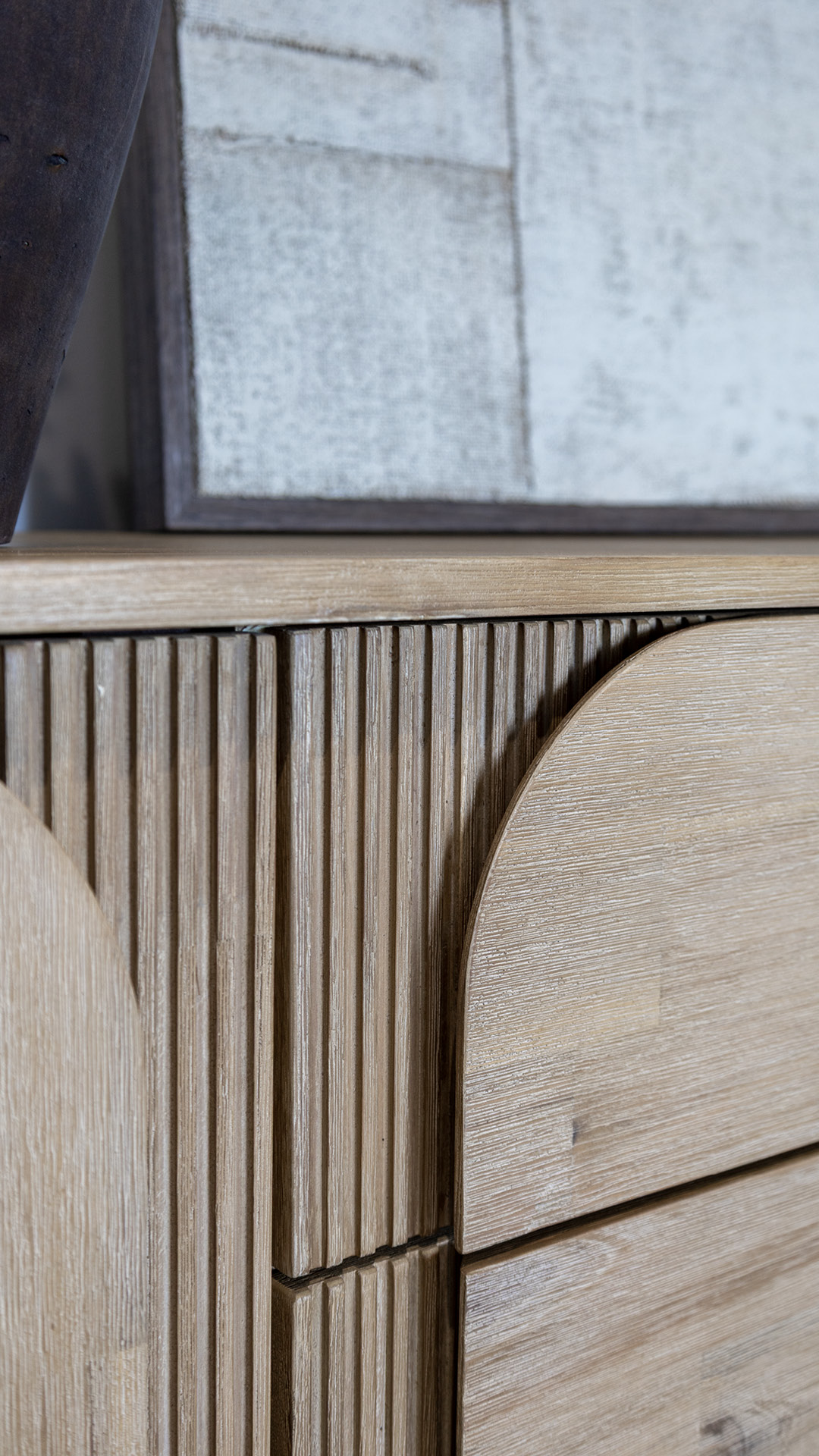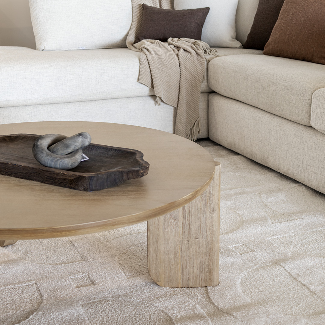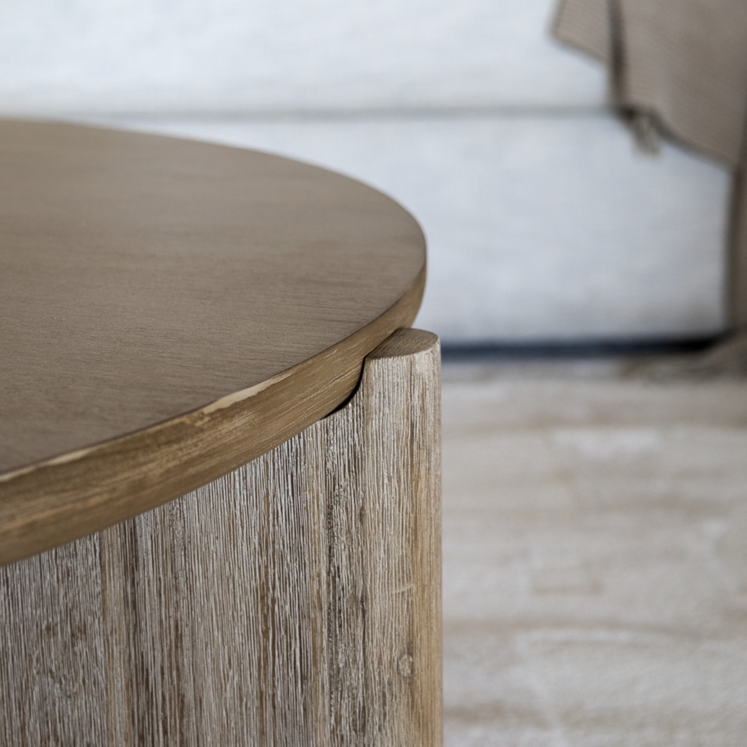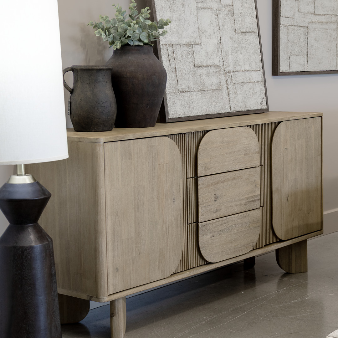 Les meubles d'appoint et de rangement complètent l'ambiance avec brio. La table basse et le buffet sont réalisés en bois d'acacia massif, finition brossée. Leurs lignes arrondies contrastent avec le reste du mobilier pour ajouter de la souplesse visuelle. On note un clin d'œil au style scandinave avec les détails en relief, les motifs verticaux et la douceur des courbes.