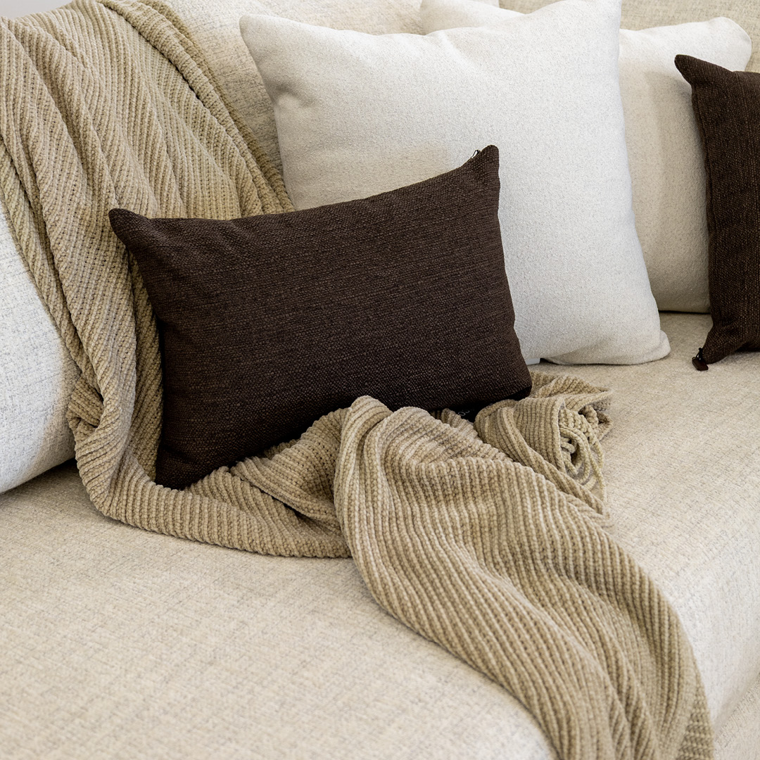 La palette choisie fait osciller l’agencement entre tons crème, beige doux et accents plus foncés, comme le brun chocolat et le poivre noir. Ces nuances profondes apportent de la richesse sans alourdir la pièce. Les coussins et jetés, soigneusement placés, ajoutent juste ce qu'il faut de contraste pour donner de la profondeur. Le tapis, quant à lui, avec ses formes géométriques en demi-cercles, reprend la même palette en ton sur ton et renforce la cohérence de l'espace.