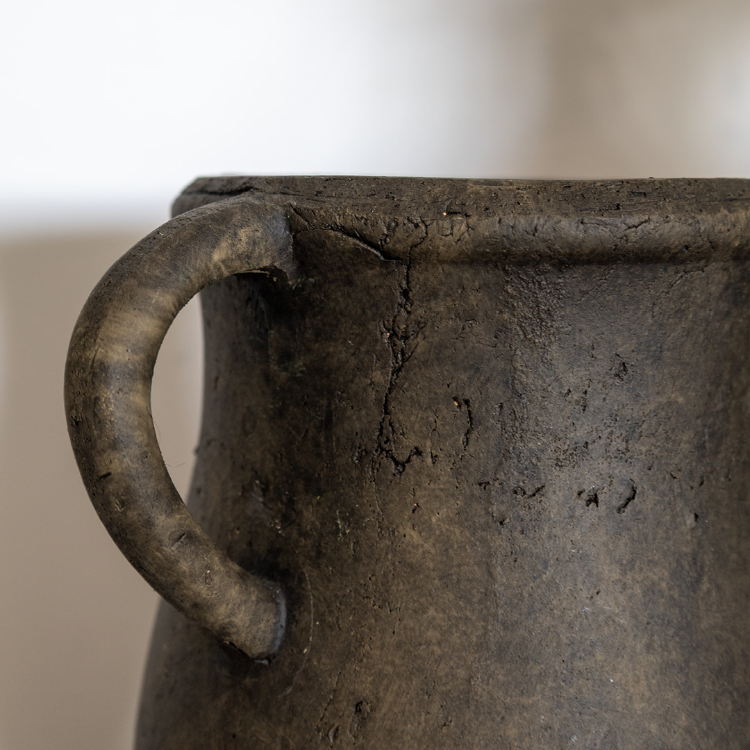Les objets décoratifs sont choisis avec soin et viennent enrichir la proposition. On remarque notamment des vases texturés, des pièces de poterie rustique ainsi qu'une lampe sur pied imposante, presque sculpturale. Ces accessoires apportent un sentiment d'authenticité, de matières brutes, mais toujours dans une douceur enveloppante. Le tableau Renwil en collage de jute, encadré d'un brun profond, crée une belle synergie entre structure et matière brute.