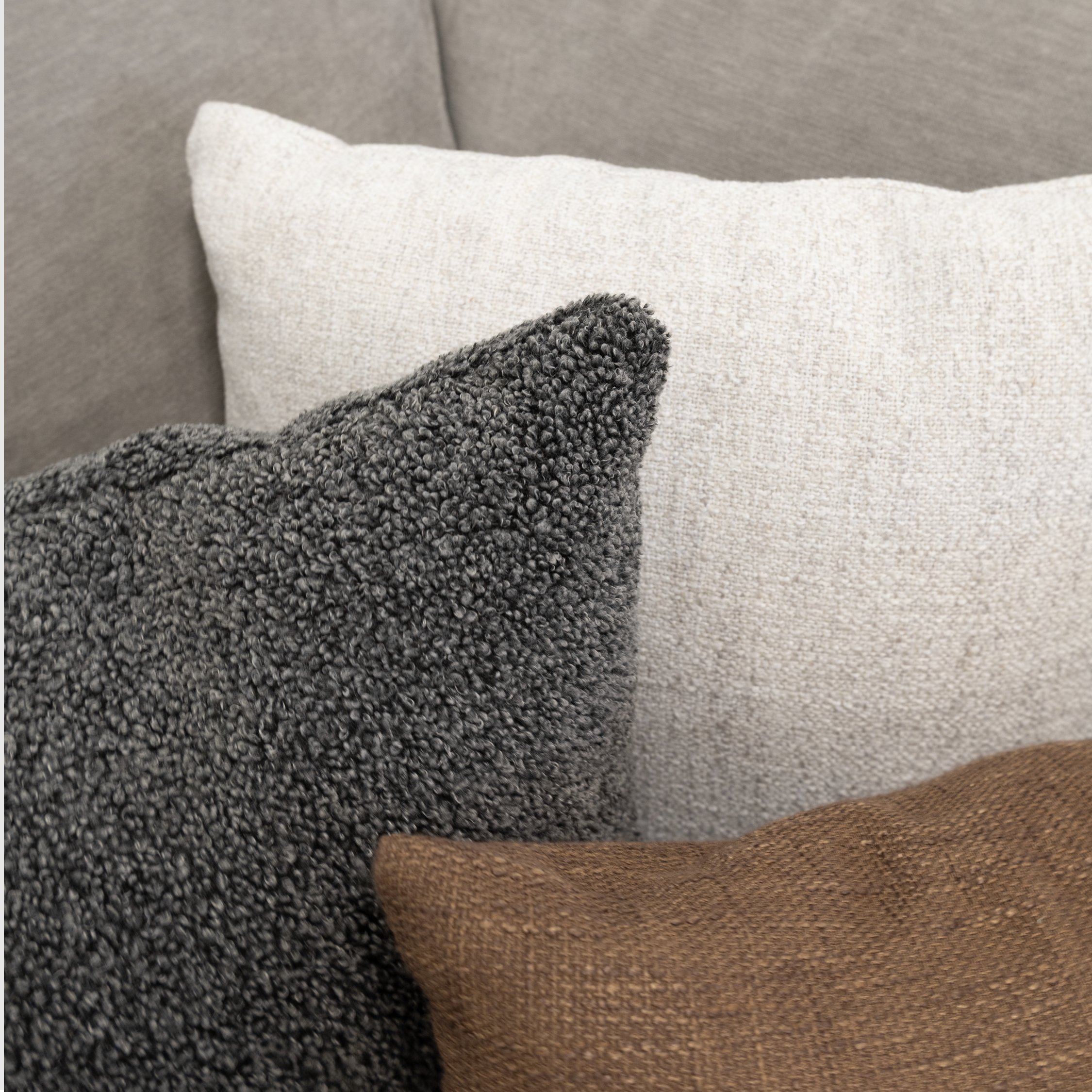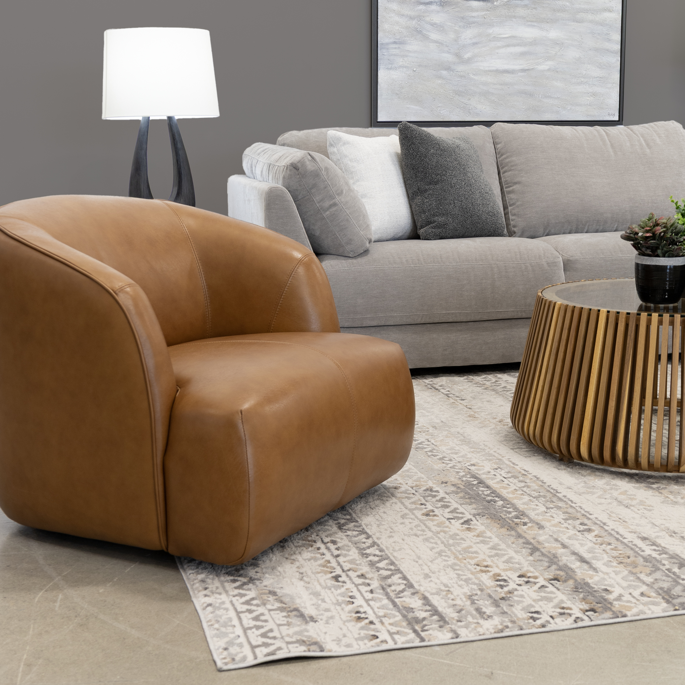 Le gris s’impose comme une base sobre et sophistiquée, offrant une toile de fond idéale pour mettre en valeur les matières, les volumes et les contrastes. Les variations de gris s’expriment dans un jeu subtil de textures et de finis, auxquels s’ajoutent des touches de brun ou de tan pour réchauffer l’atmosphère et briser la rigidité du monochrome. L’espace se construit autour de formes enveloppantes et de lignes structurées, dans un équilibre mesuré entre confort, caractère et modernité. Cette inspiration crée un décor à la fois feutré et affirmé, pensé pour un quotidien élégant et une ambiance apaisante.