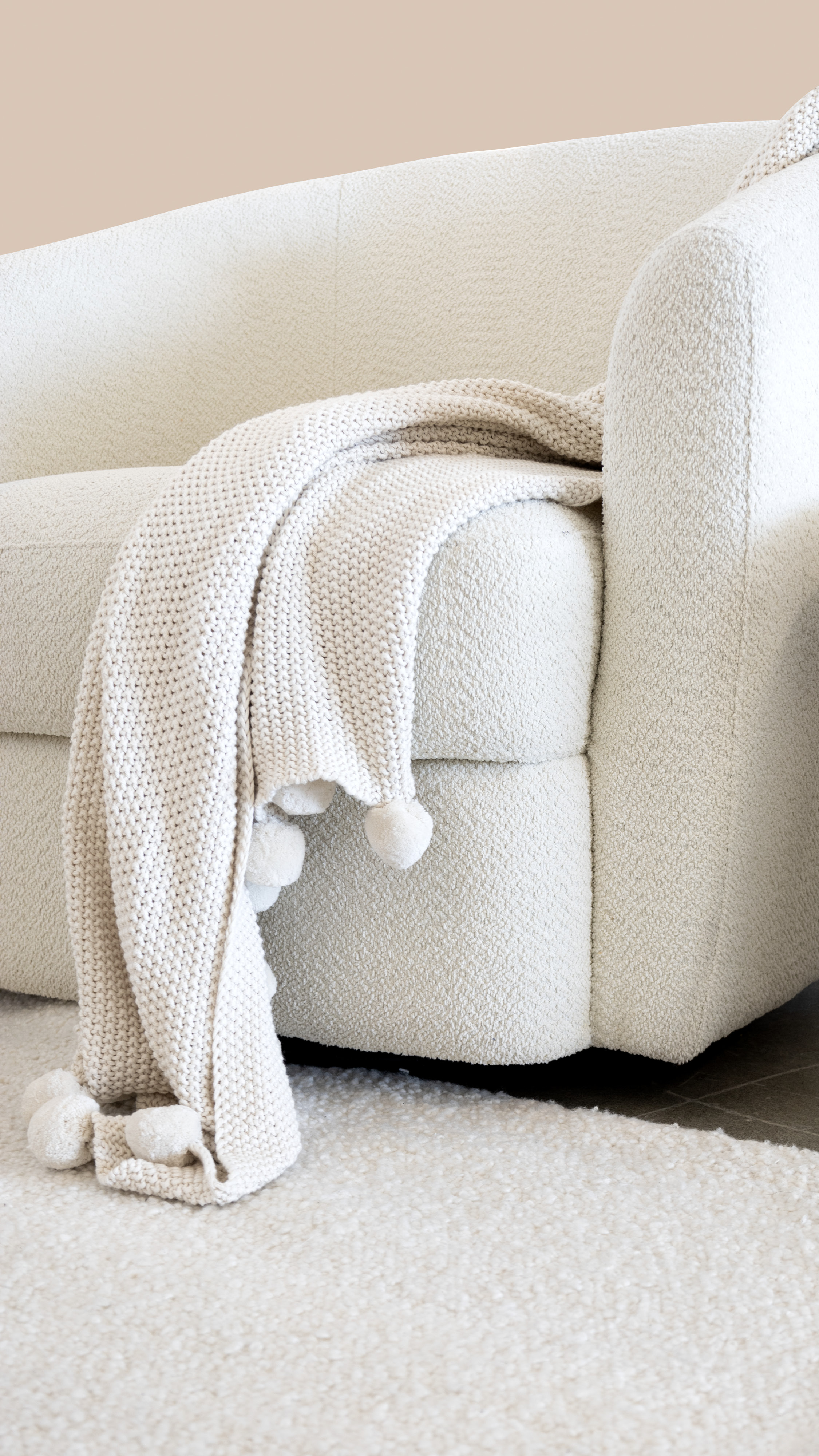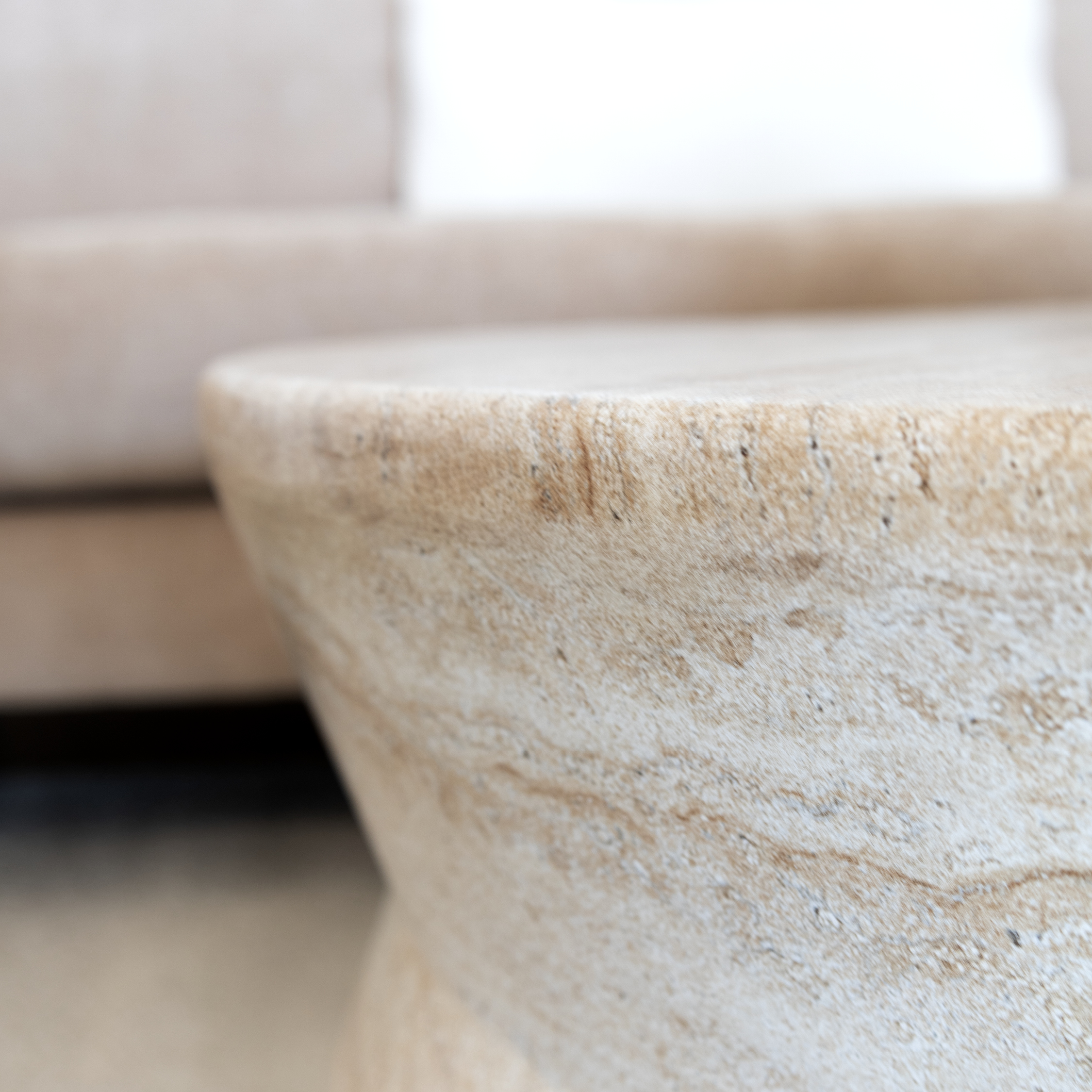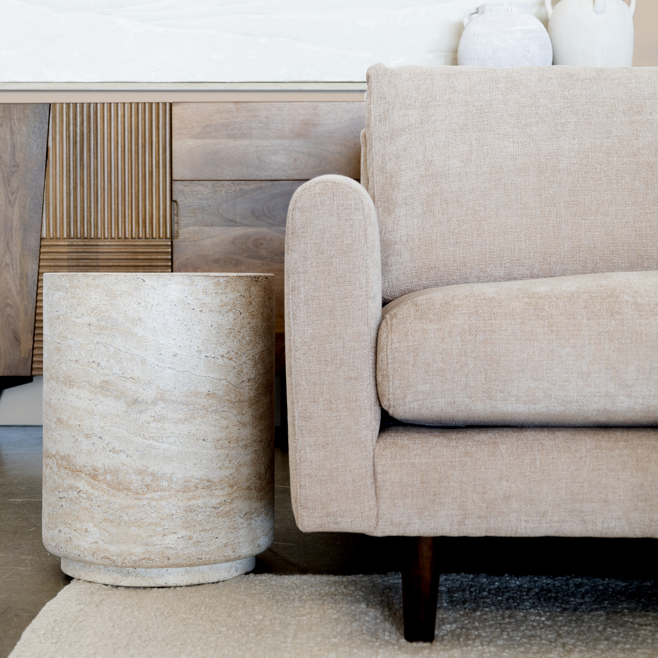 Les matières se rencontrent pour créer une harmonie tactile unique. Le fauteuil pivotant Dorset de Palliser, entièrement revêtu de tissu bouclé couleur ivoire, invite à la détente avec ses formes arrondies et enveloppantes. Son assise moelleuse apporte une dimension feutrée qui contraste avec les courbes et les surfaces minérales de la table basse en travertin. Ce matériau naturel, prisé pour son fini texturé et ses subtiles variations de tons, ancre la pièce dans une esthétique à la fois brute et sophistiquée.