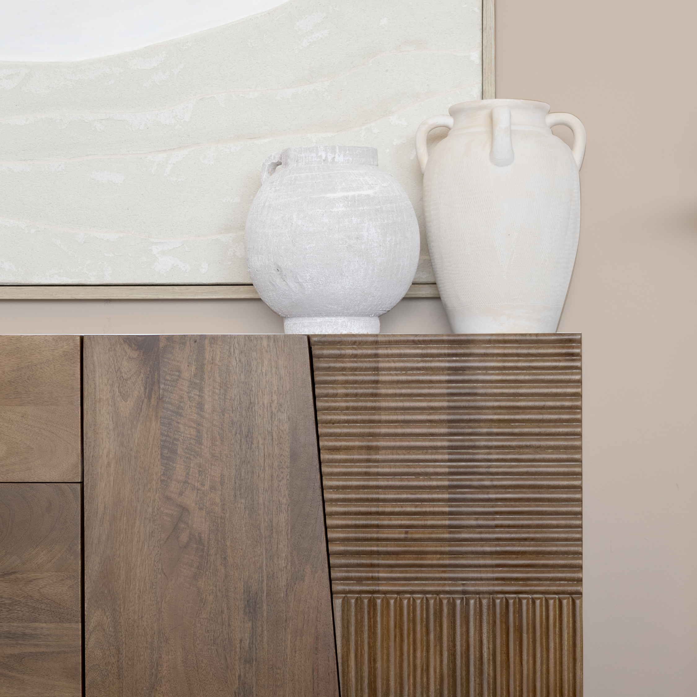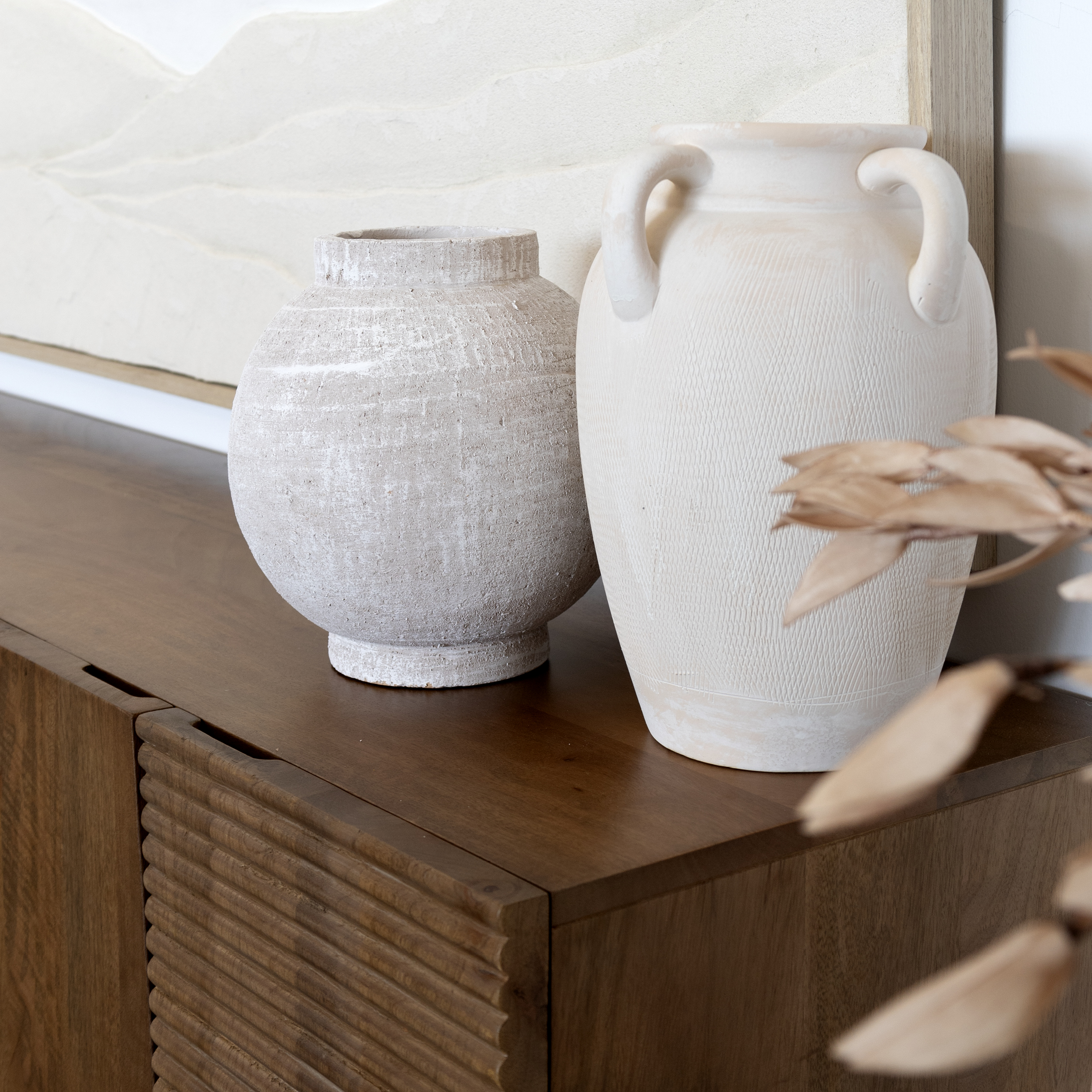 Dans cette inspiration où le beige est roi, les accessoires viennent parfaire le tout en jouant sur les nuances et les matières. Le cadre mural en relief effet sable capte la lumière et apporte une dimension intéressante, tandis que les pots en céramique texturée s’intègrent parfaitement dans cette palette douce et naturelle.