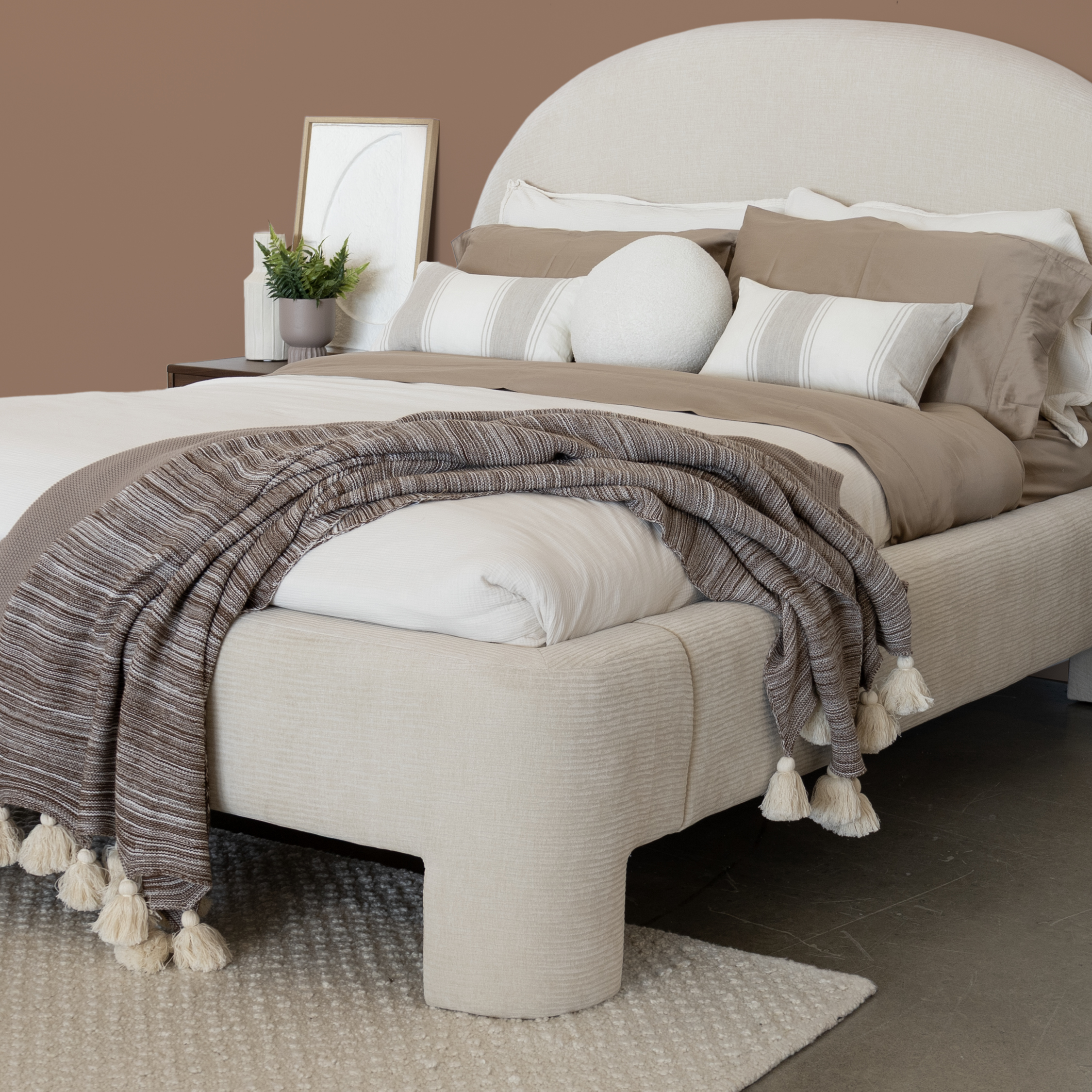 Le revêtement en velours côtelé beige ajoute du relief et une richesse tactile, en plus d’un style rétro chic qui revient en force. Associé à des draps en lin lavé ou en coton satiné, il deviendra le terrain parfait pour superposer coussins et jetés aux teintes muscade et moka.