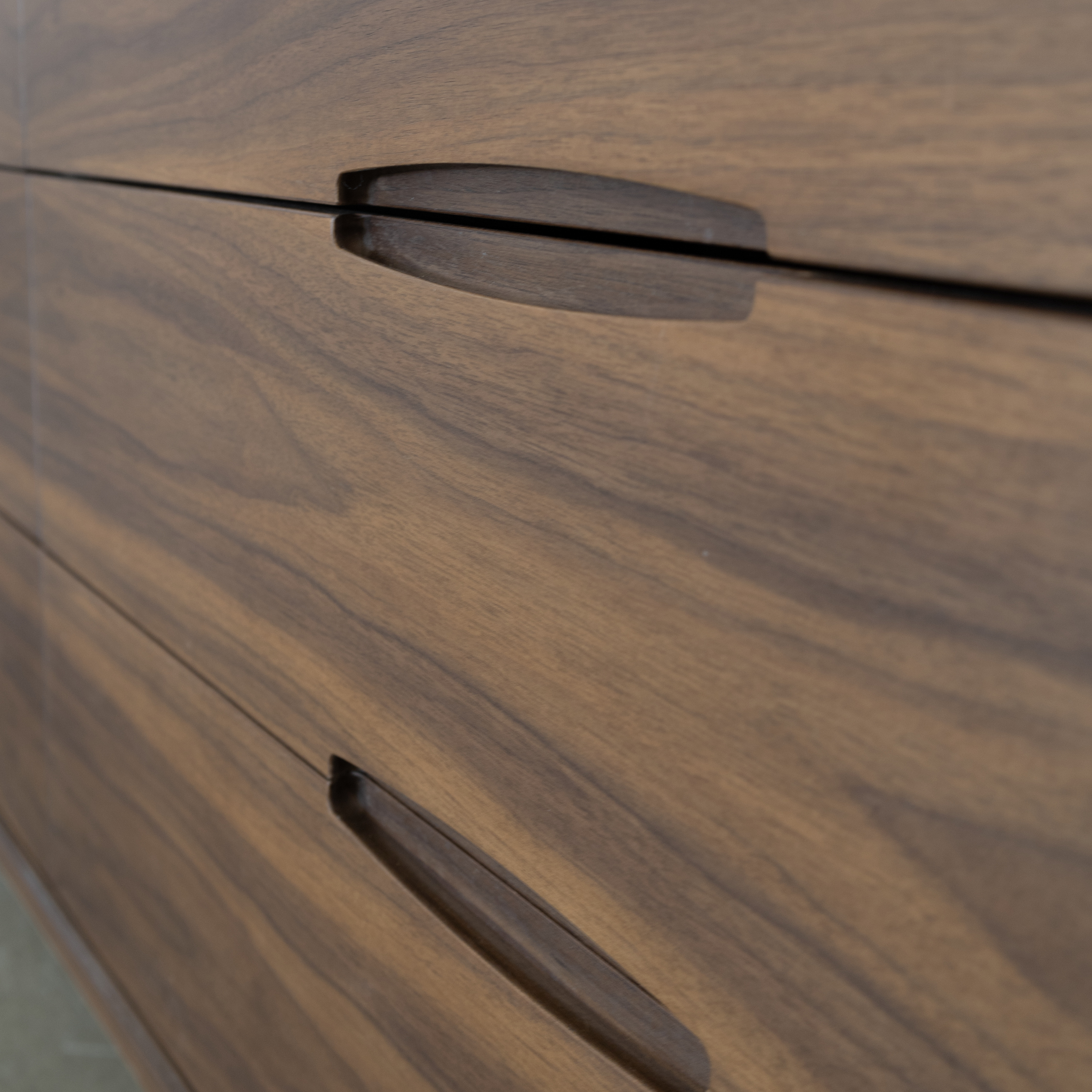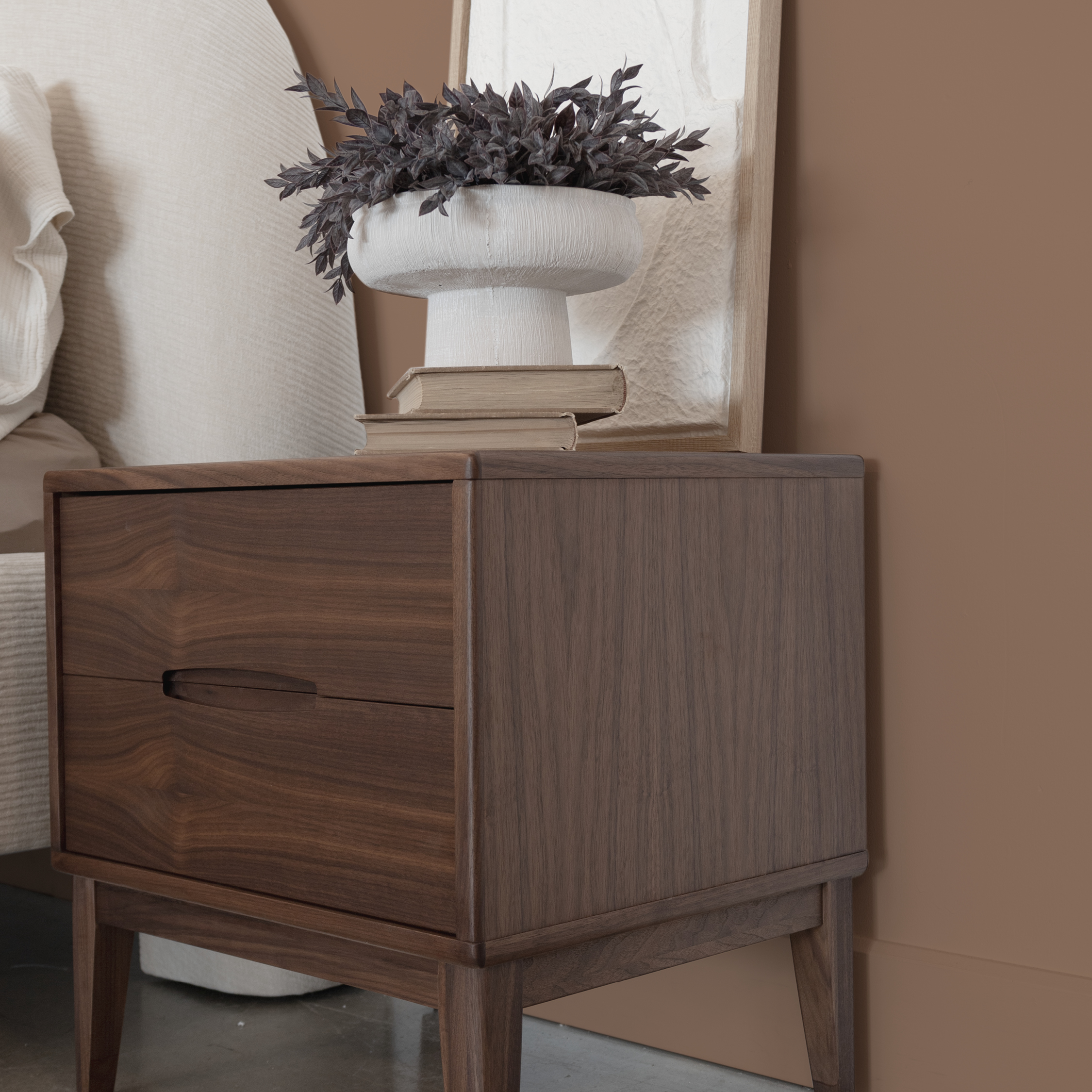 Les tables de nuit Leila de Mobican, en bois placage noyer fumé, donnent de la profondeur à la pièce. Leur design épuré et intemporel les rend parfaites pour structurer l’espace sans alourdir la pièce.