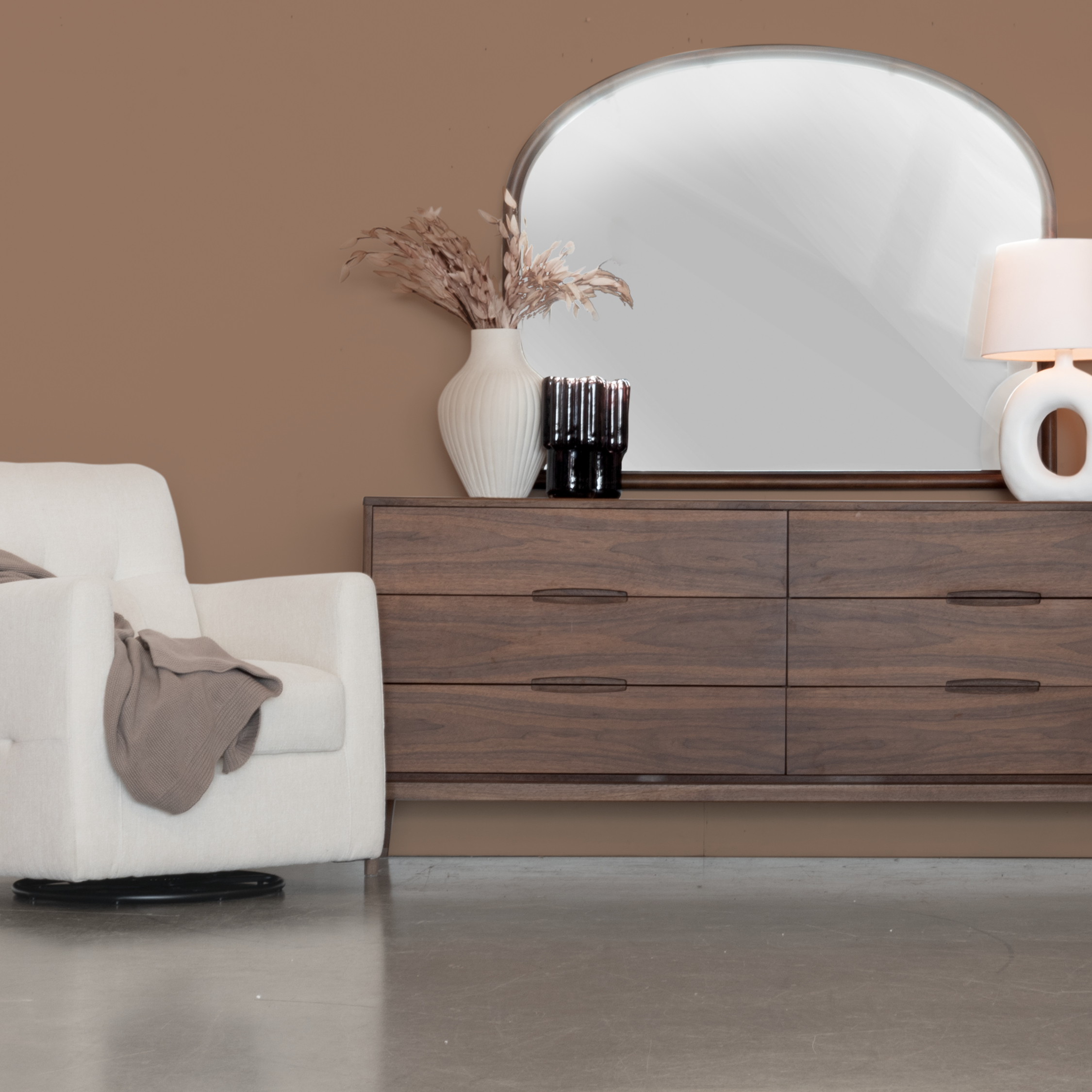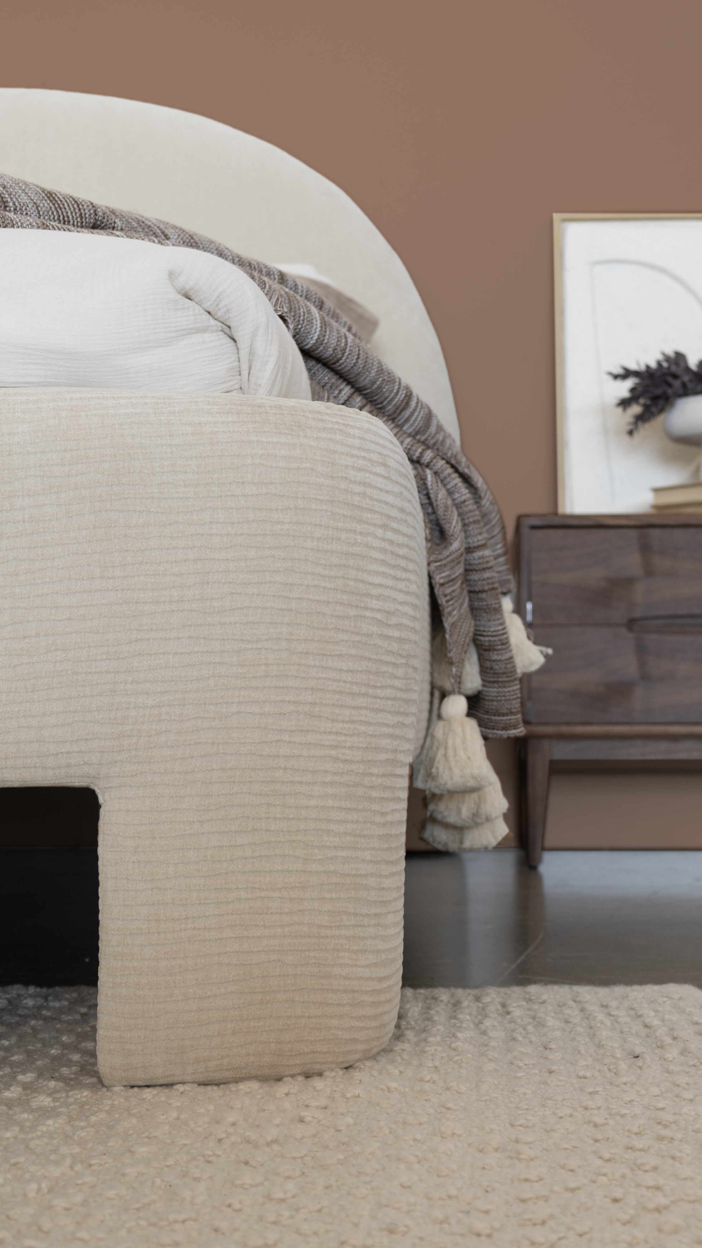 Le lit Nina est la pièce maîtresse de cette chambre, et ici, l’arrondi est à l’honneur. Avec sa tête de lit en demi-lune, il adoucit l’espace et crée un effet visuel harmonieux.