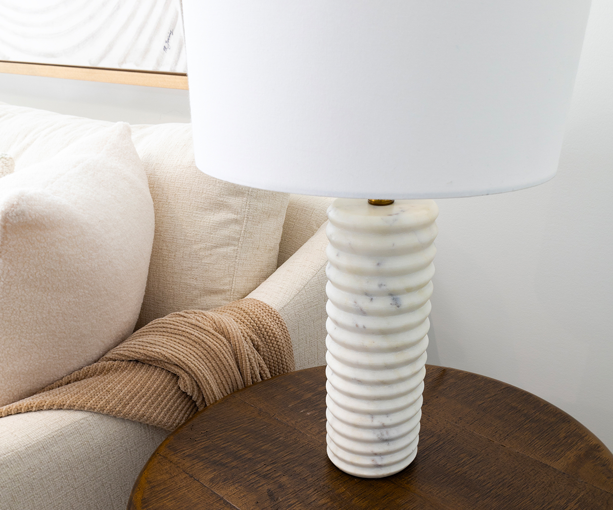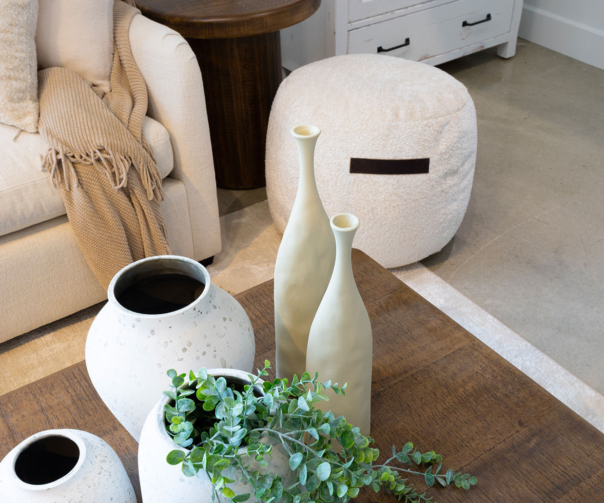 Les accessoires artistiques ajoutent la touche finale à ce tableau élégant. La lampe en marbre blanc Sumner, inspirée de l'architecture, apporte une lumière douce et sophistiquée. Les vases en céramique au fini brut et naturel complètent l'esthétique, apportant une note organique supplémentaire à la pièce.