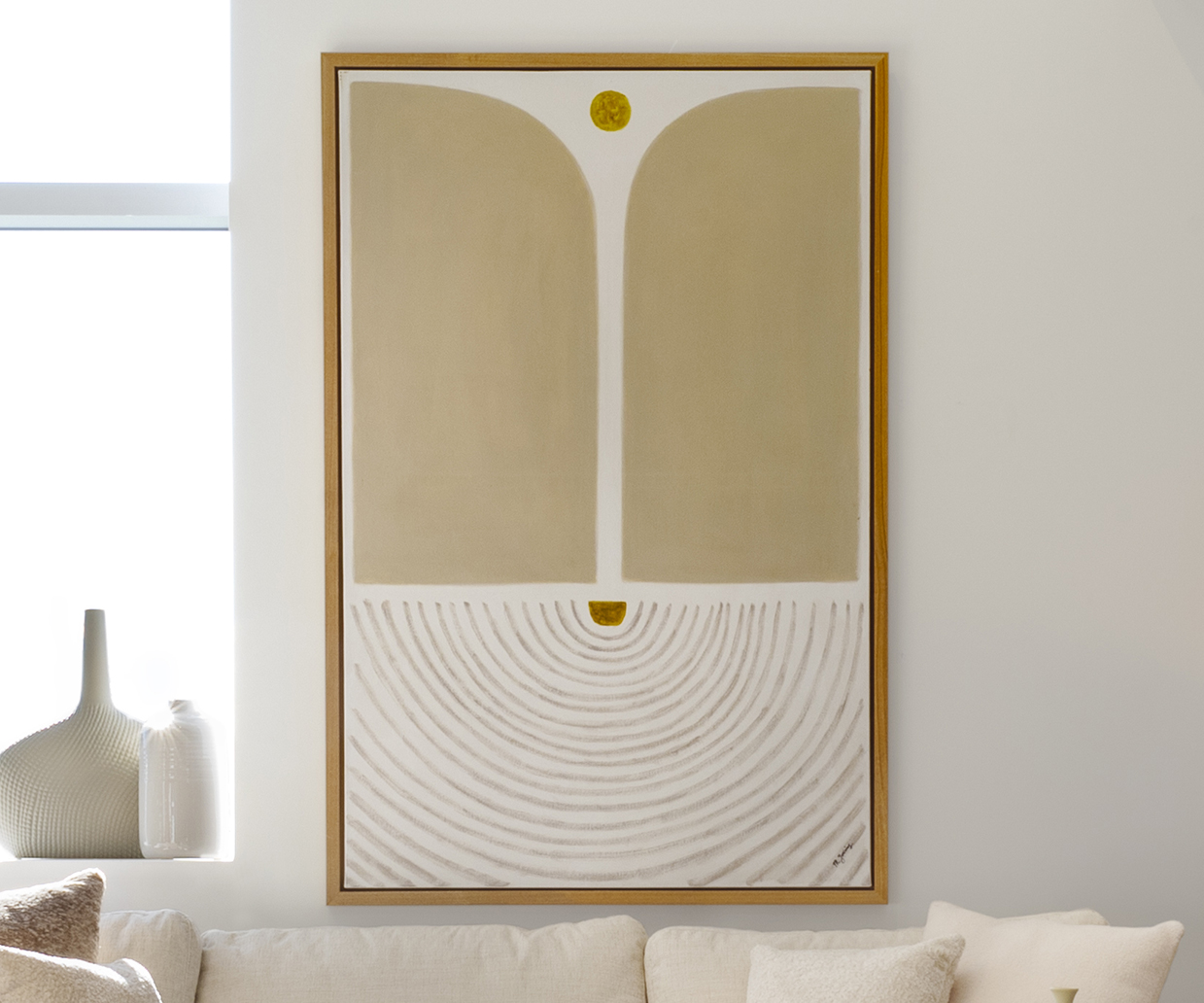 Enfin, le tableau Martia de Renwill, avec son effet bold, se dresse comme une déclaration artistique audacieuse au sein de cet espace. Il capture l'essence même de la tendance du bouclé et du sherpa, apportant une énergie dynamique qui s'harmonise parfaitement avec le caractère doux, calme et apaisant de l'ensemble.
