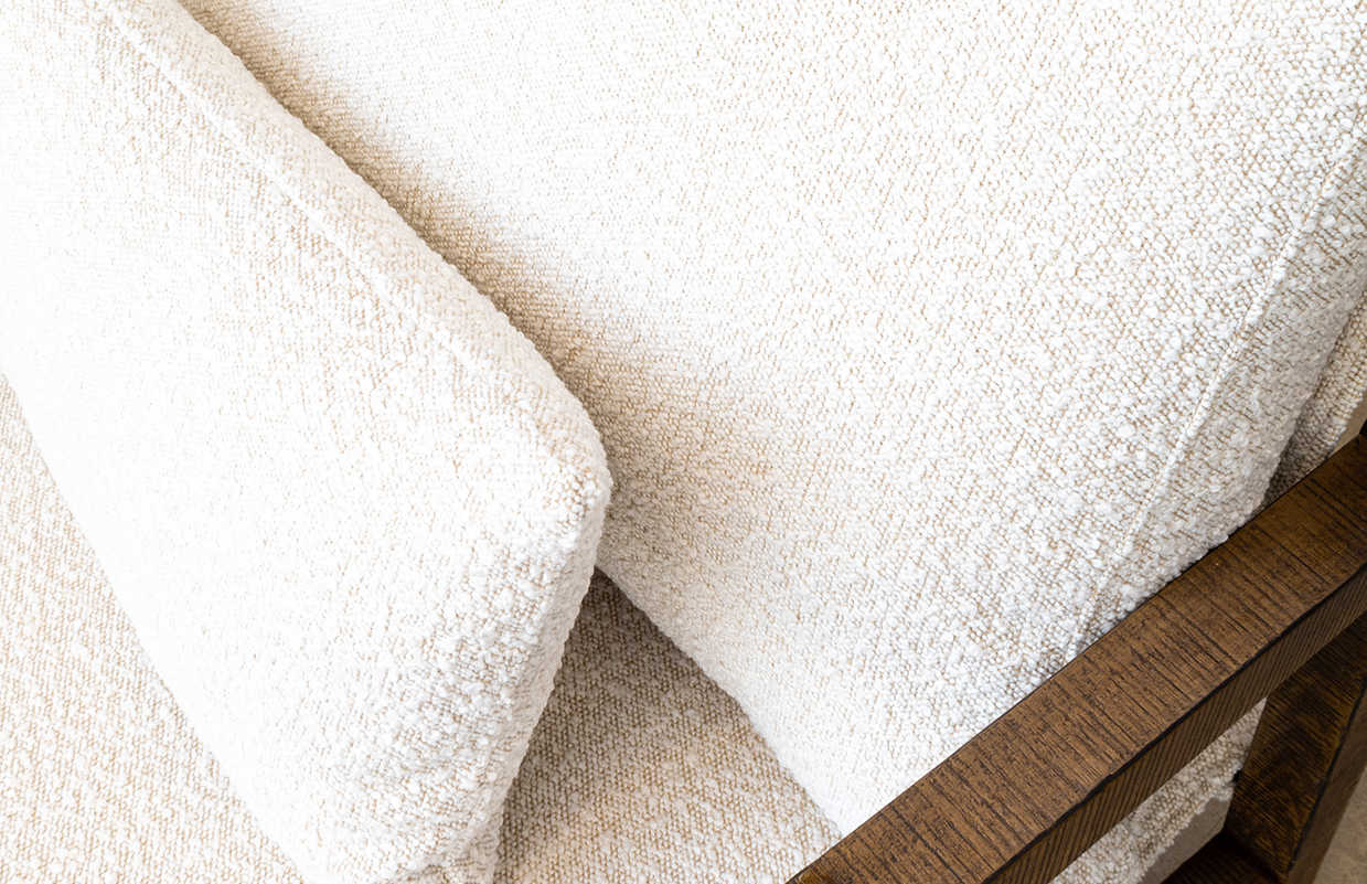Les tables centrales et d'appoint, sont également des pièces d'importation du Mexique, réalisées avec du bois de manguier écoresponsable, doté d'un fini brossé qui ajoute une note organique et contemporaine. Les formes fluides de ces pièces créent une harmonie avec la texture enveloppante du bouclé et du sherpa, évoquant un équilibre entre modernité et tradition.