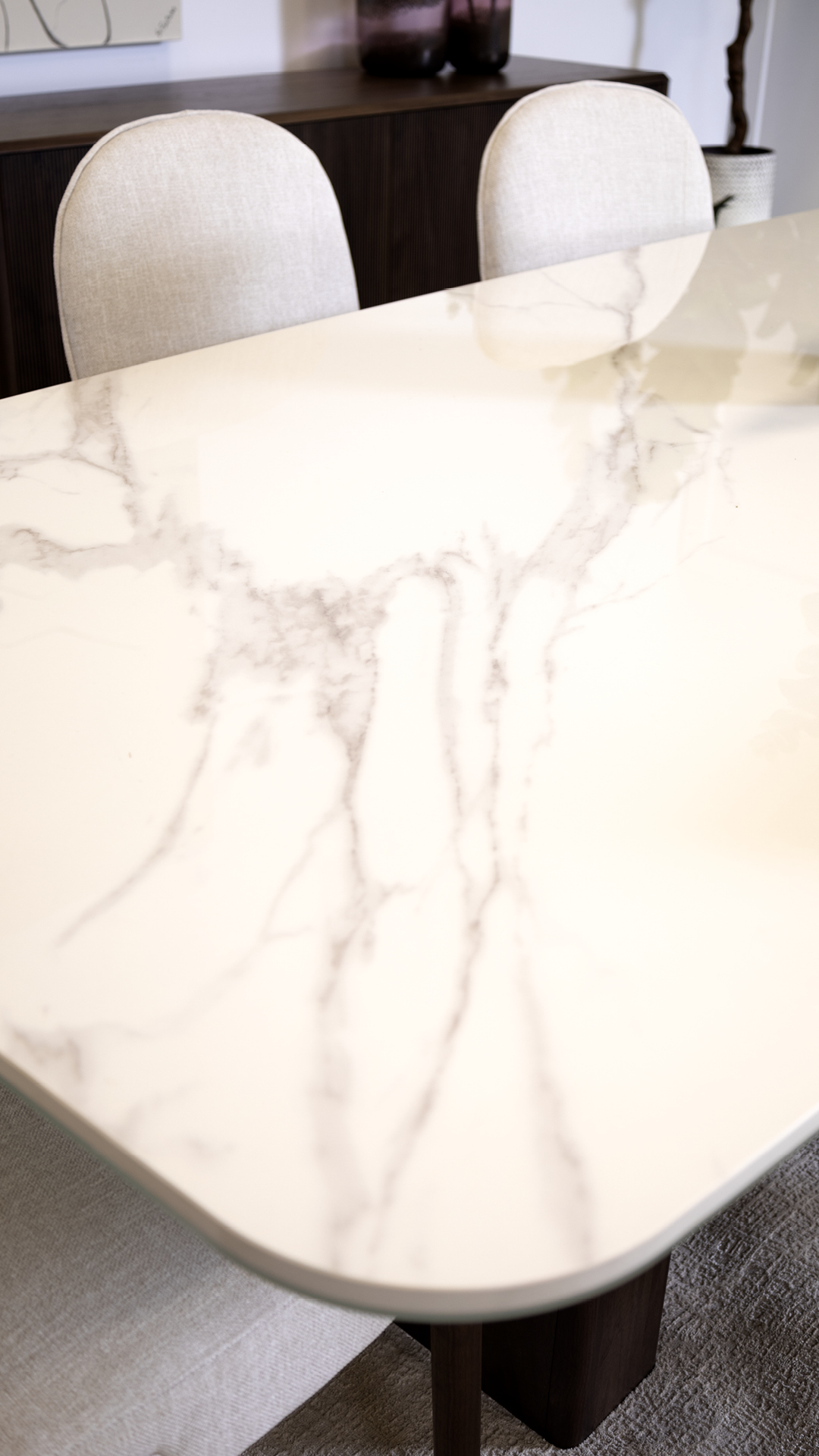 Les couleurs sable et moka enveloppent l’espace d’une lumière douce et pure, tandis que les touches de brun profond et d’ocre apportent une profondeur réconfortante. Les décorations en verre fumé et céramique texturée ajoutent des accents élégants, jouant avec la lumière pour une touche de modernité subtile.