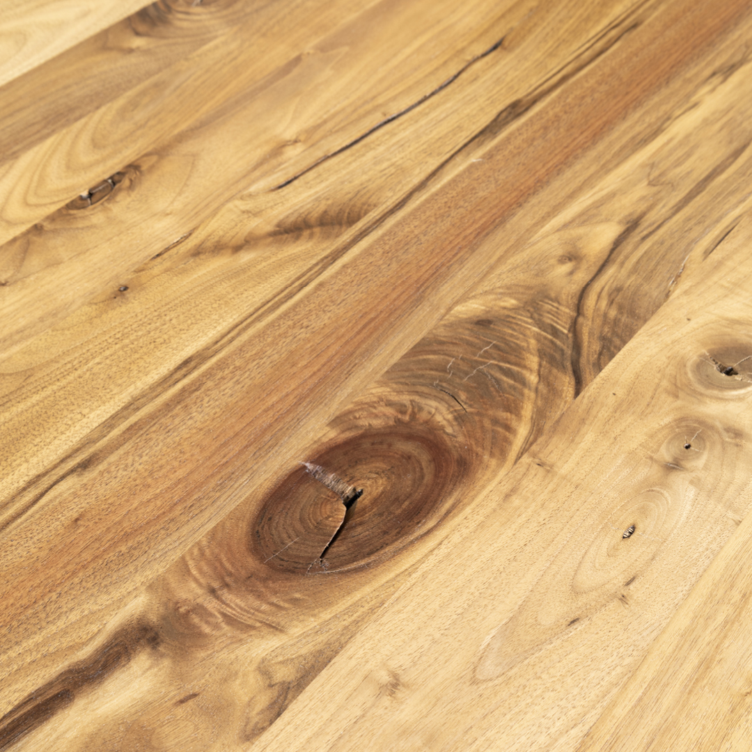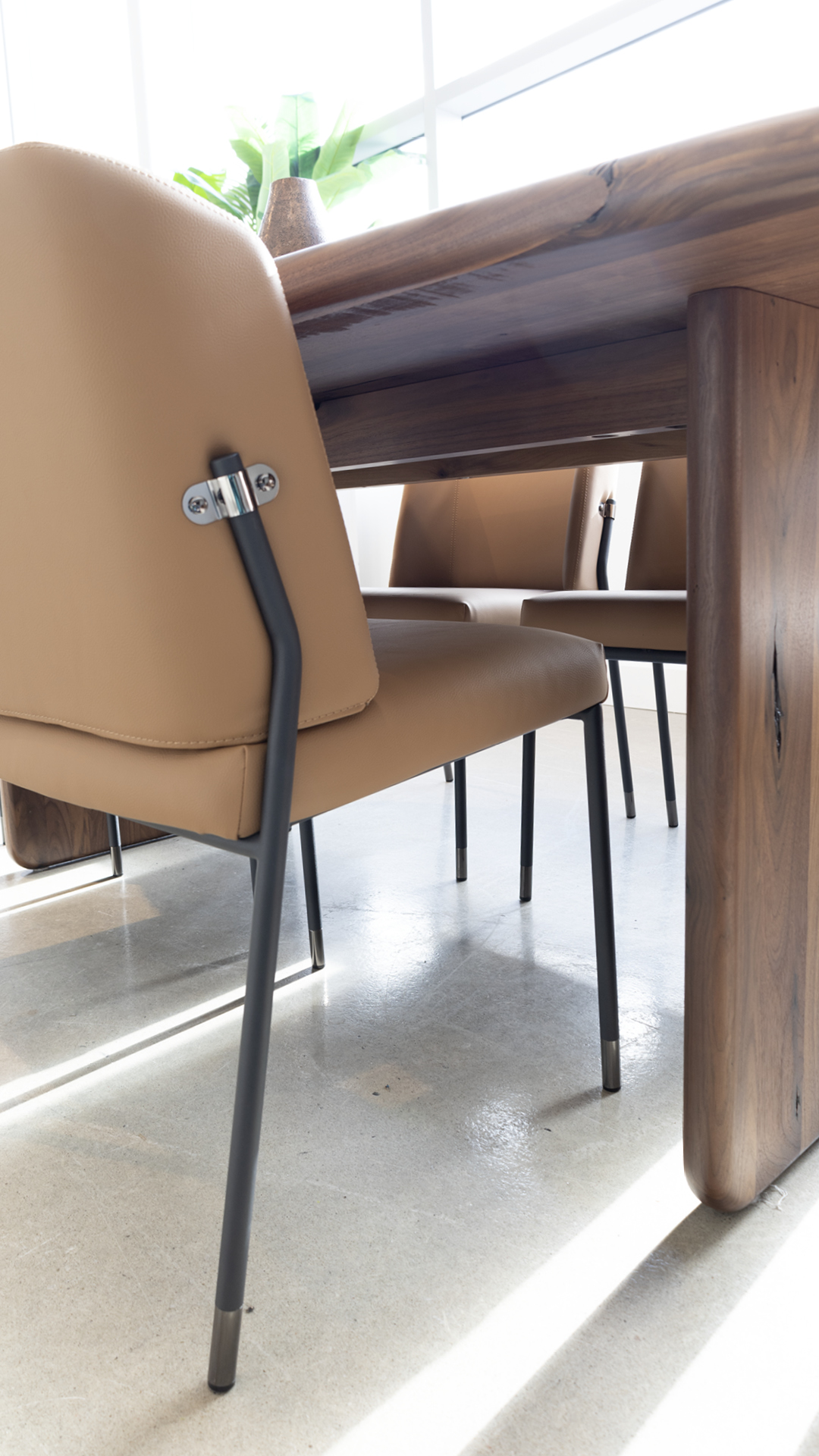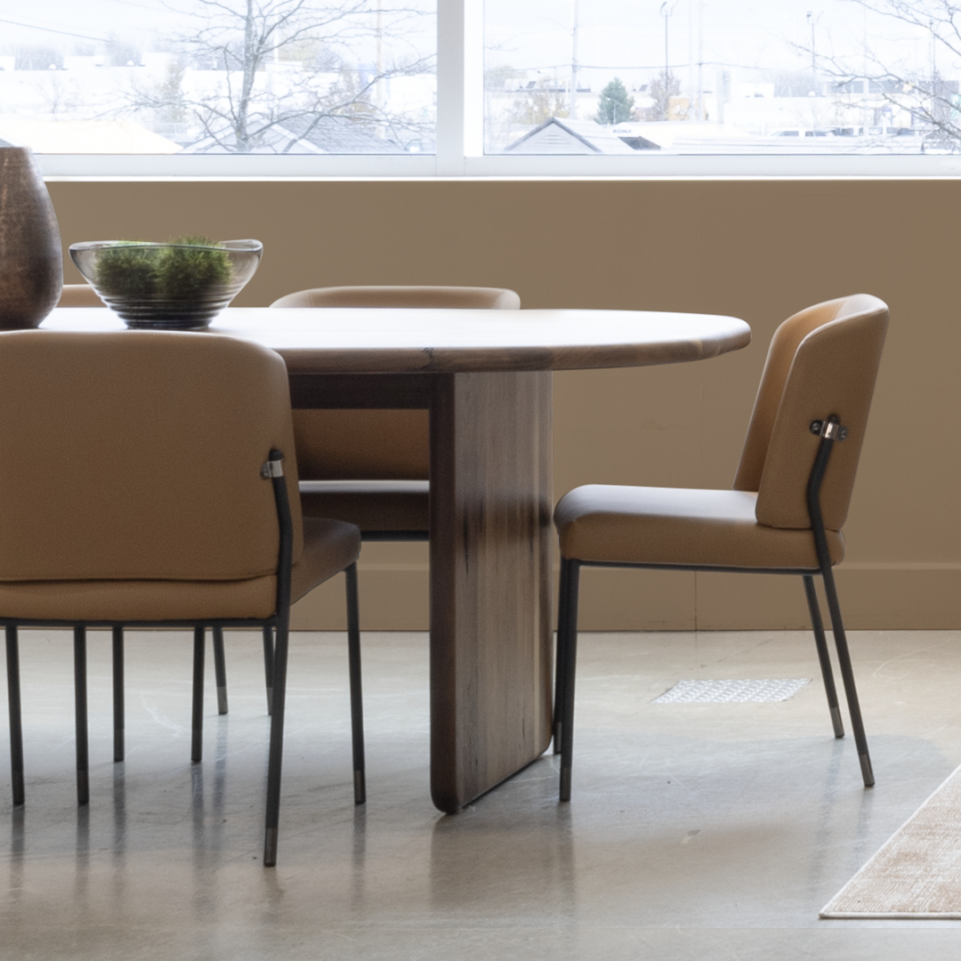 Ce bois massif aux teintes chaleureuses s’accorde à la perfection avec les chaises Liz en cuir couleur sable chaud. Leur look moderne, avec des pattes en métal noir, introduit une touche industrielle subtile qui contraste magnifiquement avec l’aspect organique de la table.