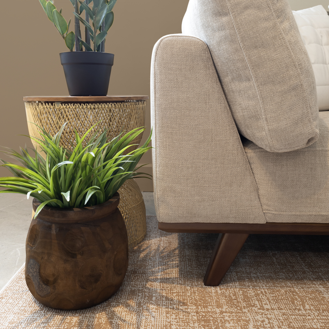 Les fibres naturelles, les textures brutes et la présence abondante de plantes créent un équilibre harmonieux entre esthétique et bien-être. Le tapis placé sous le sectionnel, ajoute une continuité visuelle apaisante tandis que les coussins texturés et les jetés en laine apportent une dimension enveloppante.