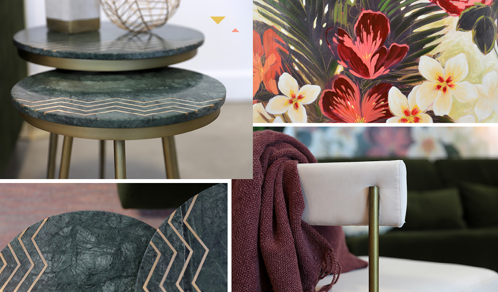 Dans leurs versions plus éclatées, le vert, le rose et le doré forment un trio qui plaira aux amateurs de décors funkys. Vivifiant à souhait, cet heureux mélange donnera du punch à votre pièce, comme dans ce salon dont la magnifique toile fleurie permet de lier harmonieusement les teintes.