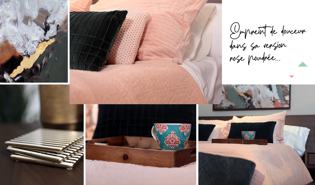 À la recherche d’un décor plus apaisant? Jetez votre dévolu sur les verts et les roses plus tendres, comme dans cette chambre à coucher. Mention spéciale au couvre-lit, qui invite au repos et à la grasse matinée.