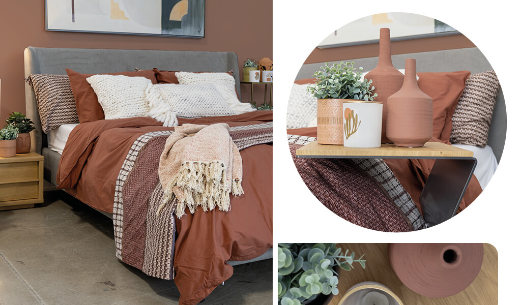 Le secret de cette sublime chambre à coucher, c’est la couleur terracotta et le mariage des différentes matières. On y retrouve le coton, les lainages, le bois, l’osier et la terre cuite. Cette combinaison ajoute beaucoup de richesse à la pièce et lui donne une belle touche d’originalité.