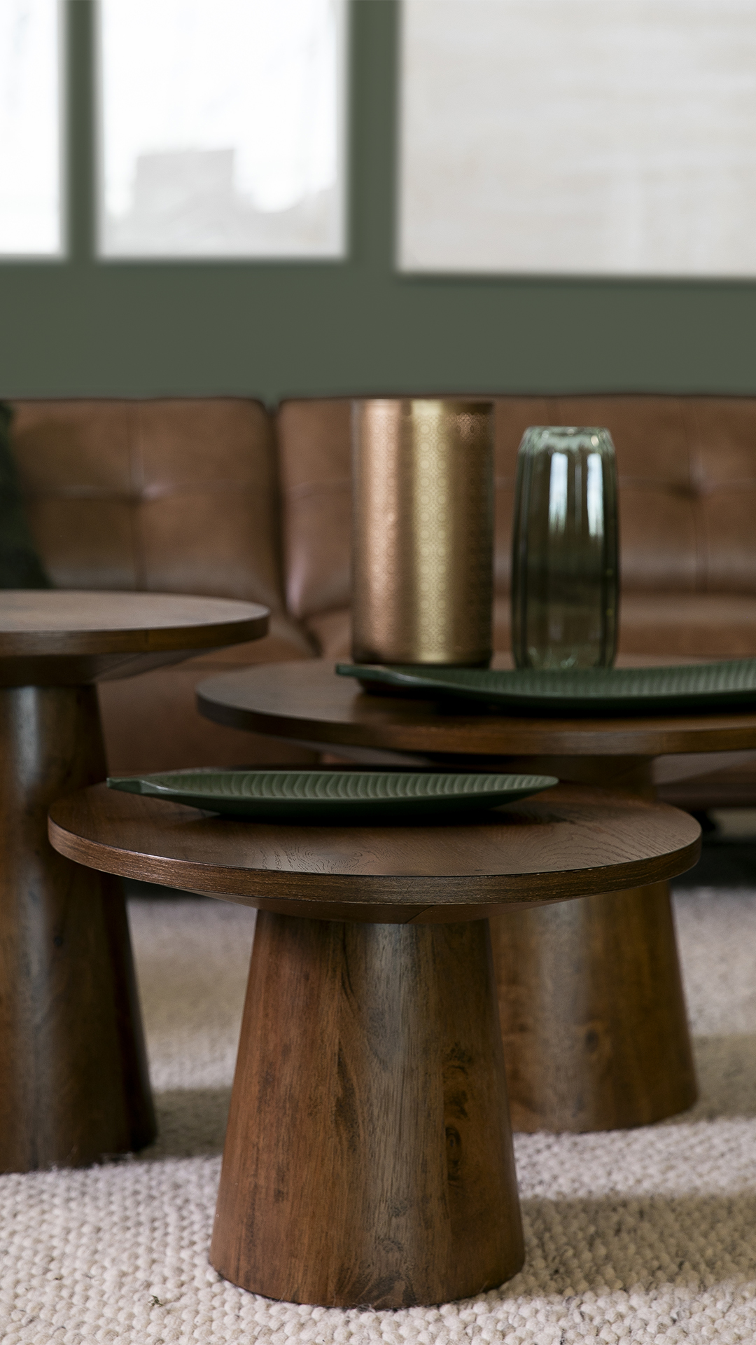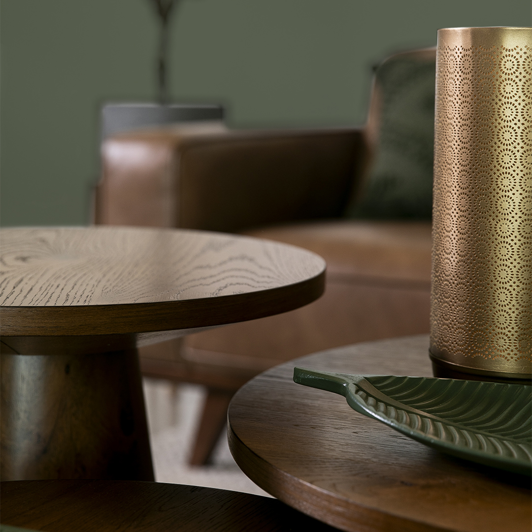 Les tables de salon Rory, en bois de noyer, viennent compléter le décor. Leur design en trio permet une grande flexibilité d'utilisation. Rapprochez-les pour y déposer un café ou un livre, ou dispersez-les pour servir un mini-buffet lors de vos soirées conviviales. Ces tables apportent une touche de naturel et chaleureuse, en plus de leur originalité.
