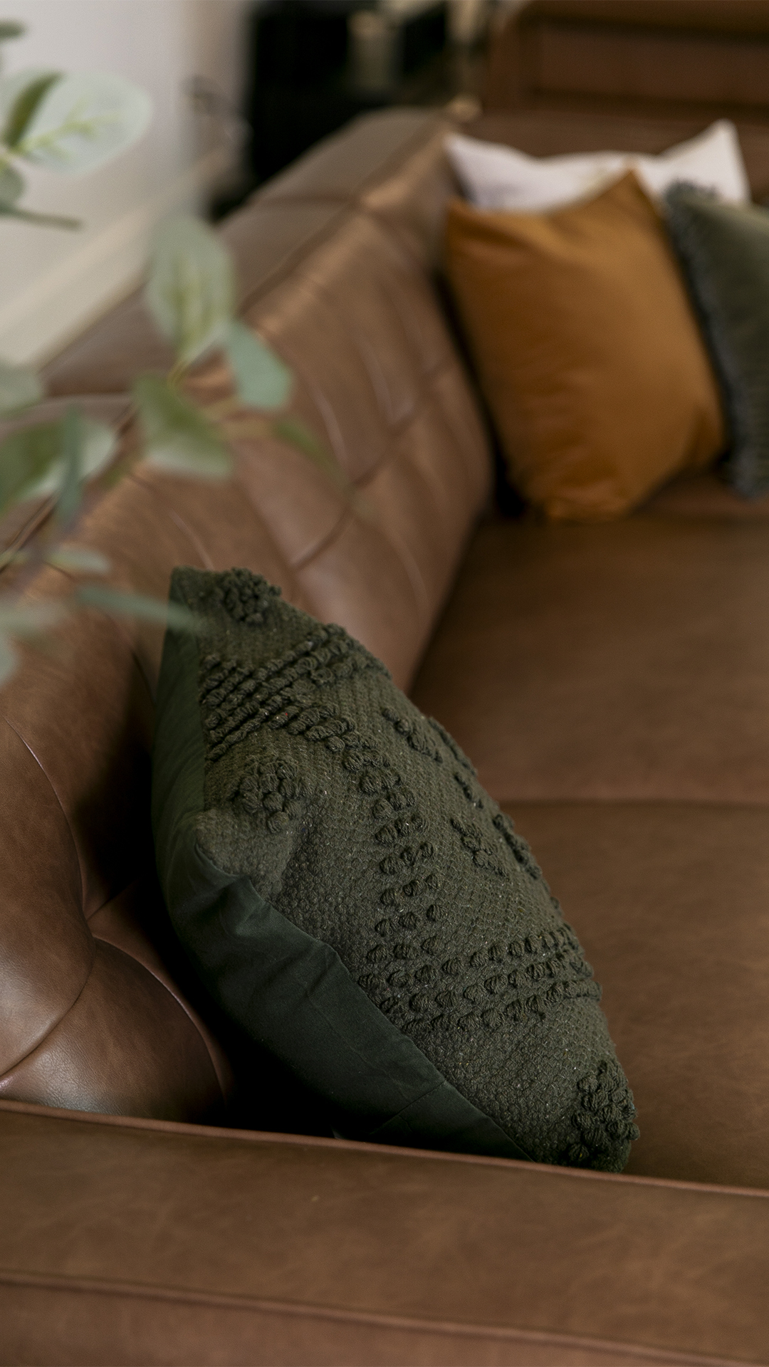 Le sectionnel Vince, avec sa base en bois et son revêtement en polyuréthane, est la pièce maîtresse de ce salon. Sa couleur cognac s'harmonise avec le vert olive foncé des accessoires pour ajouter du caractère au décor. Conçu dans un style mid-century moderne, ce sectionnel à dossier bas n'encombre pas la pièce, mais au contraire, la structure et l'agrandit, tout en offrant un confort maximal. De plus, son prix raisonnable en fait un choix accessible pour ceux qui cherchent à combiner design et fonctionnalité, sans compromettre leur budget.