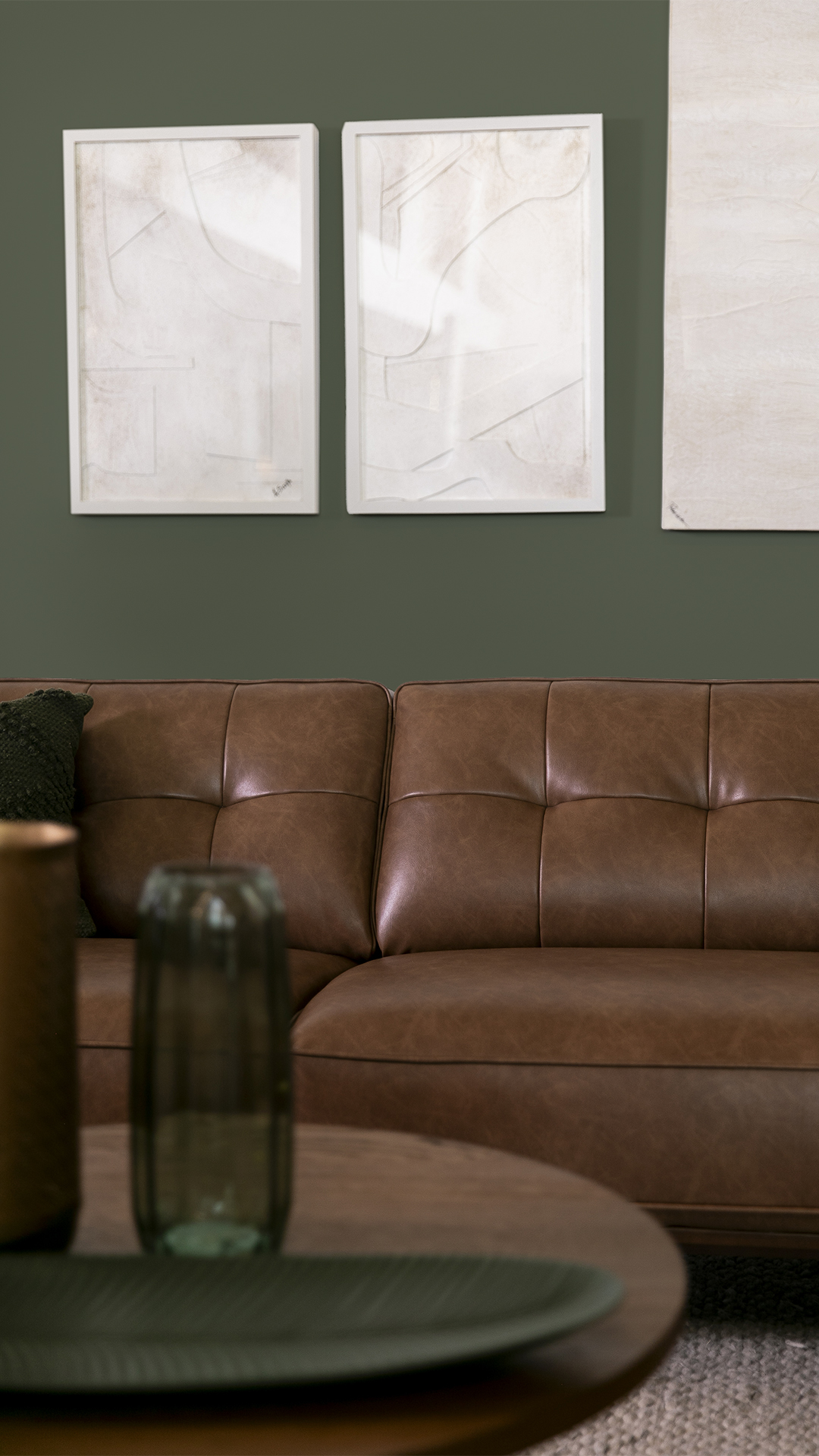 Dans cette version salon de cette inspiration, la pièce à vivre devient un véritable refuge où le vert foncé et le brun se rencontrent pour créer une ambiance sophistiquée et accueillante. Ces teintes, à la fois riches et enveloppantes, sont parfaitement adaptées pour un salon des plus chic.