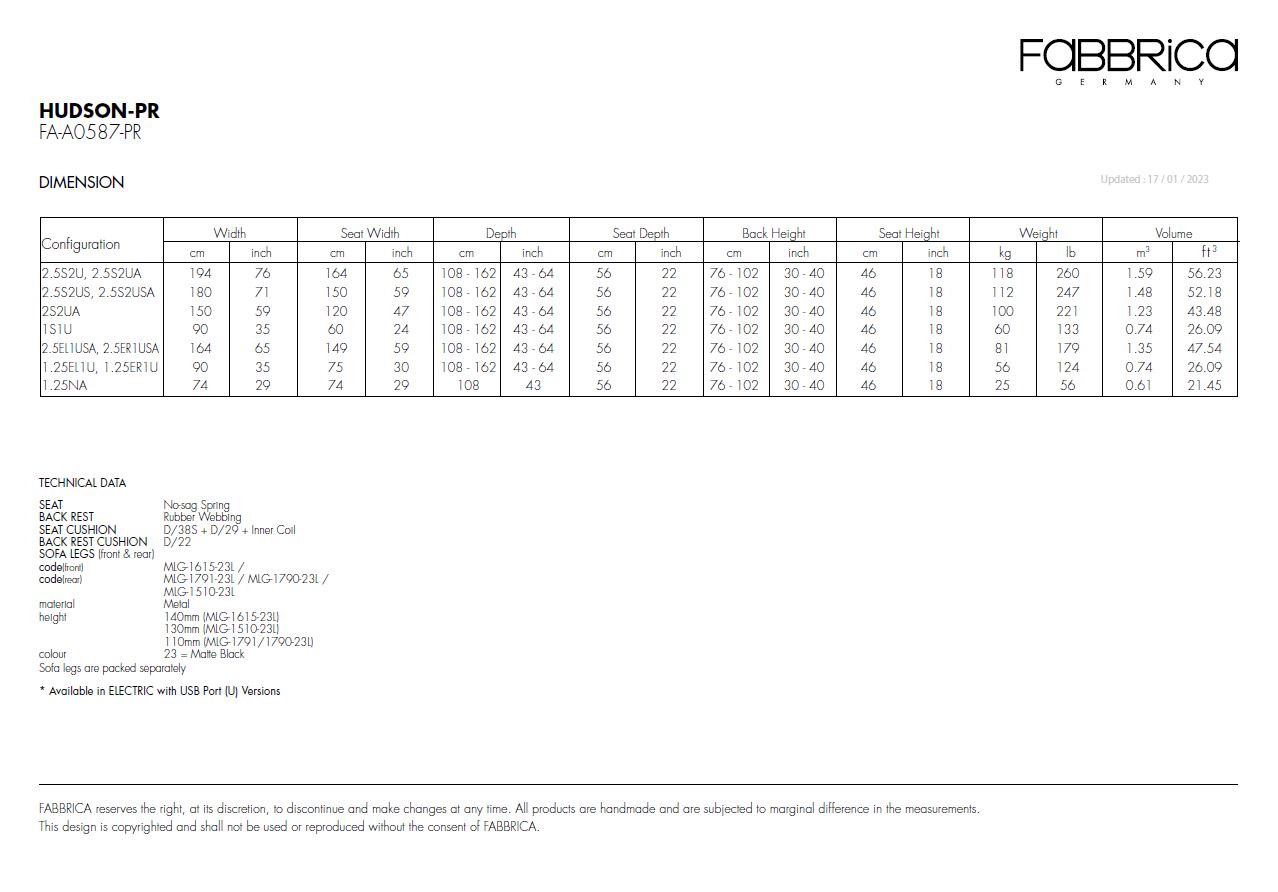Mouvement et modernité s'associent aux caractéristiques élégantes et au style sculptural de la collection Hudson. Les sieges encadrés d'accoudoirs fins et confortable permettent de réduire l'encombrement sans sacrifier la largeur d'assise, ce qui convient parfaitement aux petits espaces et à la vie urbaine. Inclinable élèctrique, tete ajustable élèctrique.Choix de cuir ou tissus