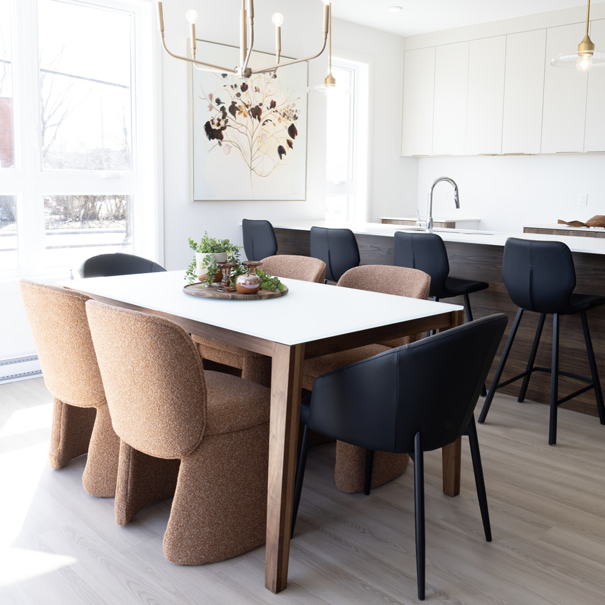 Dans la salle à manger, le mobilier en noyer fait un clin d’œil élégant aux armoires de cuisine. Nous avons sélectionné une table et un buffet Mobican avec plateau en verre blanc nuage, qui ajoutent une touche aérienne tout en s’harmonisant à la richesse du bois. Les chaises en tissu cannelle, avec leur texture chaleureuse, viennent ajouter de la profondeur et du caractère.