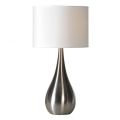 Une magnifique lampe de table avec un abait-jour en lin fini blanc cassé avec un base en acier inoxydable en forme de goutte.