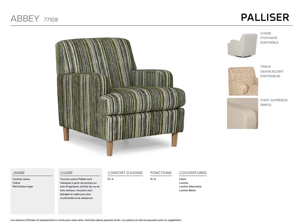Avec ses lignes épurées et son design intemporel, le fauteuil Abbey s’intègre harmonieusement aux décors modernes, transitionnels ou classiques. Sa silhouette sobre met en valeur un confort raffiné, parfait pour compléter un salon, une chambre ou un espace lecture.